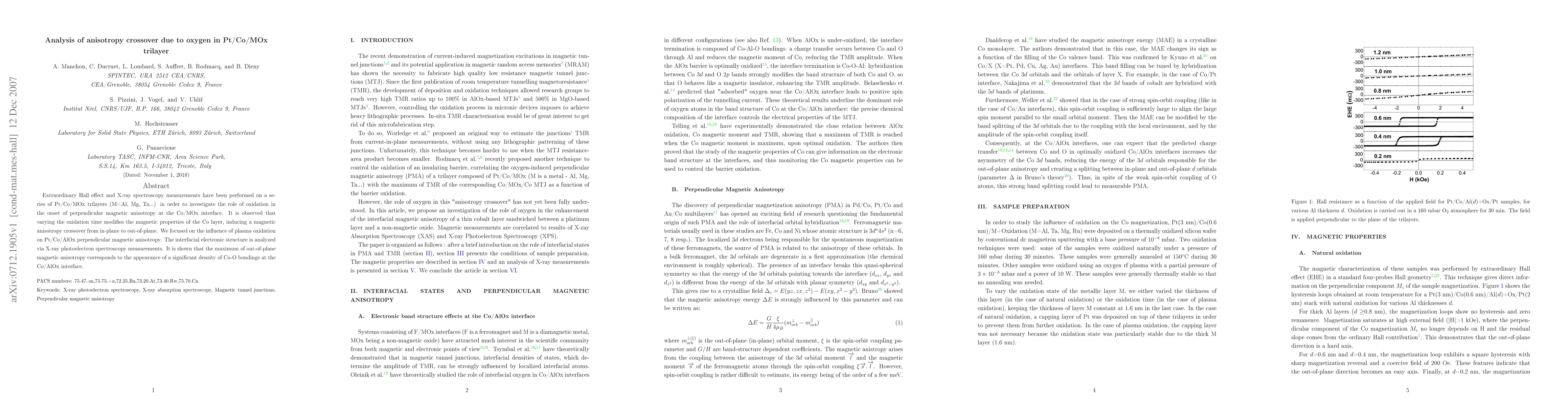 Extraordinary Hall effect and X-ray spectroscopy measurements have been performed on a series of Pt/Co/MOx trilayers (M=Al, Mg, Ta...) in order to investigate the role of oxidation in the onset of perpendicular magnetic anisotropy at the Co/MOx interface. It is observed that varying the oxidation time modifies the magnetic properties of the Co layer, inducing a magnetic anisotropy crossover from in-plane to out-of-plane. We focused on the influence of plasma oxidation on Pt/Co/AlOx perpendicular magnetic anisotropy. The interfacial electronic structure is analyzed via X-ray photoelectron spectroscopy measurements. It is shown that the maximum of out-of-plane magnetic anisotropy corresponds to the appearance of a significant density of Co-O bondings at the Co/AlOx interface.