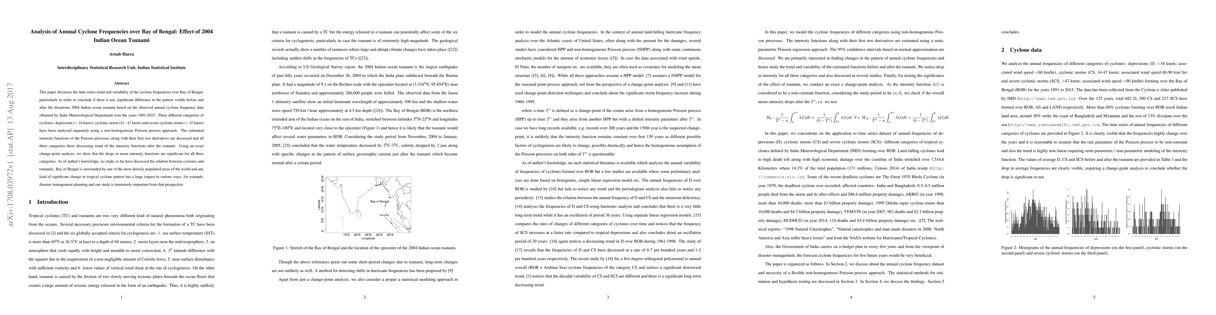 This study analyzes annual cyclone frequencies over the Bay of Bengal, finding a significant decrease in cyclone intensity functions post-2004 Indian Ocean tsunami, using non-homogeneous Poisson processes and change-point analysis. The findings suggest a notable shift in cyclone patterns, which is crucial for disaster management planning.