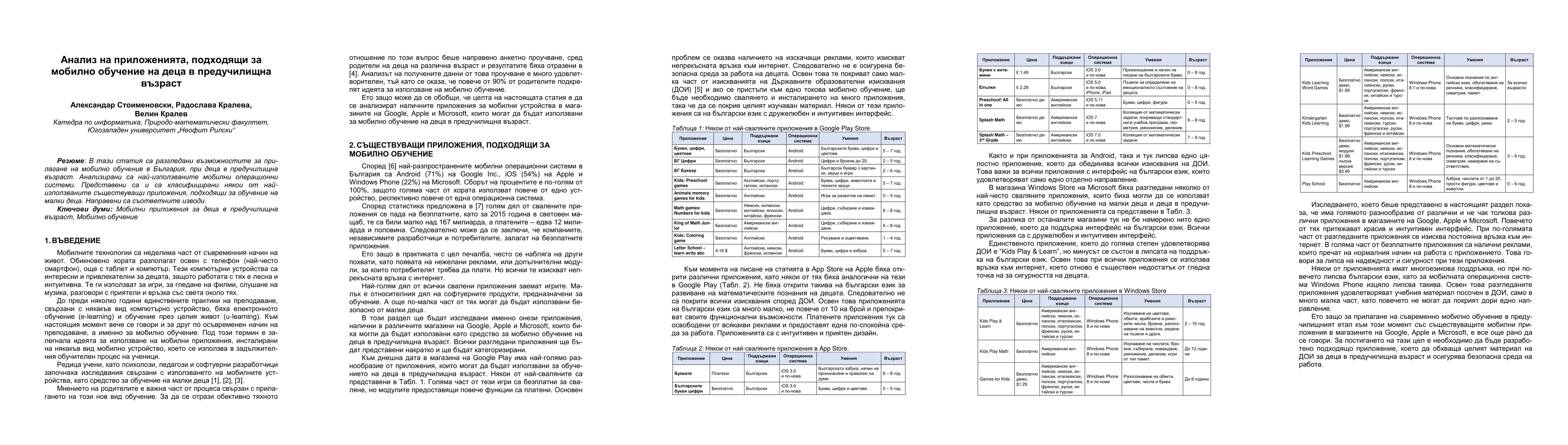 This paper analyzes mobile learning applications in Bulgarian preschool education, focusing on the most used mobile operating systems and classifying popular apps suitable for young children. Keywords include mobile applications for preschool children and mobile learning.