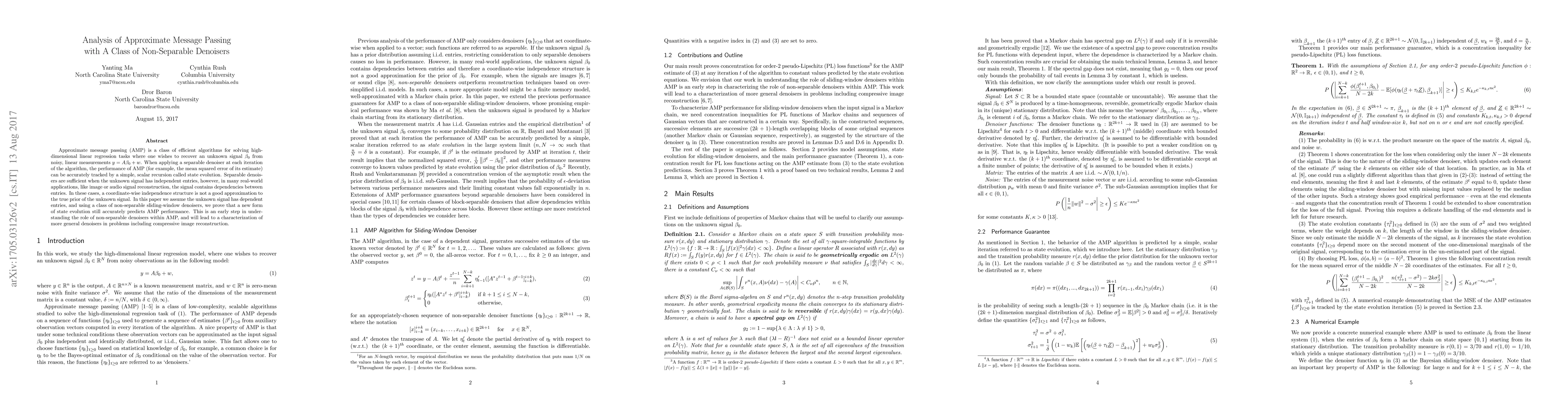 This paper investigates the application of non-separable denoisers in approximate message passing (AMP) algorithms for high-dimensional linear regression, demonstrating that a new form of state evolution can accurately predict AMP performance even when the unknown signal has dependent entries. This lays the groundwork for understanding more complex denoisers in applications like image reconstruction.