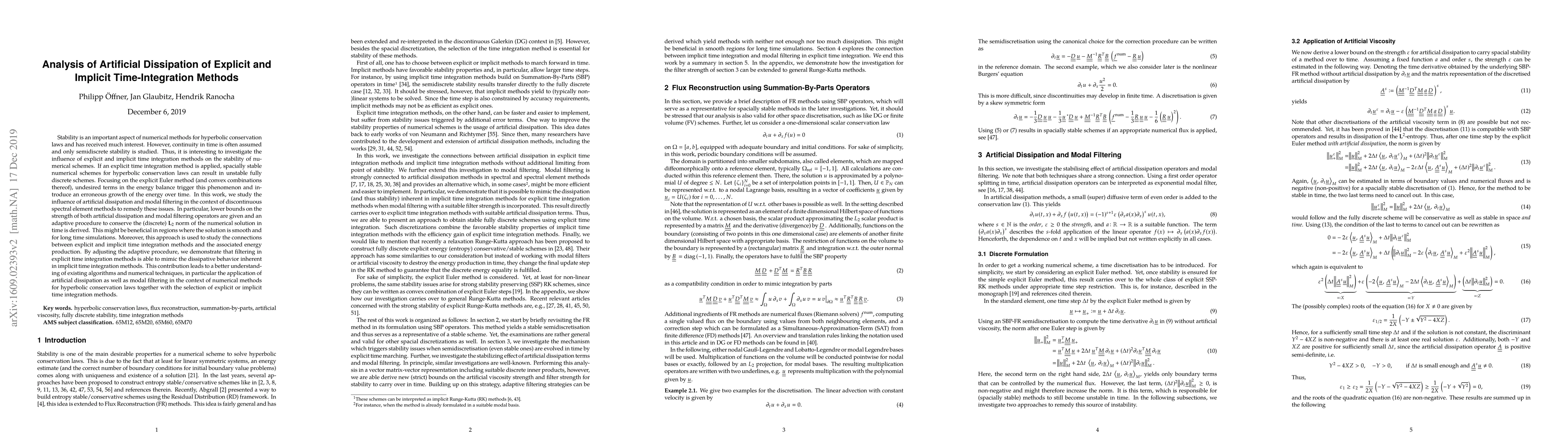 This paper investigates the stability issues arising from explicit and implicit time integration methods in numerical schemes for hyperbolic conservation laws, focusing on the explicit Euler method. It proposes the use of artificial dissipation and modal filtering to mitigate instability and introduces an adaptive procedure to conserve the $\mathbf{L}_2$ norm, demonstrating the potential for explicit methods to mimic the dissipative behavior of implicit methods.