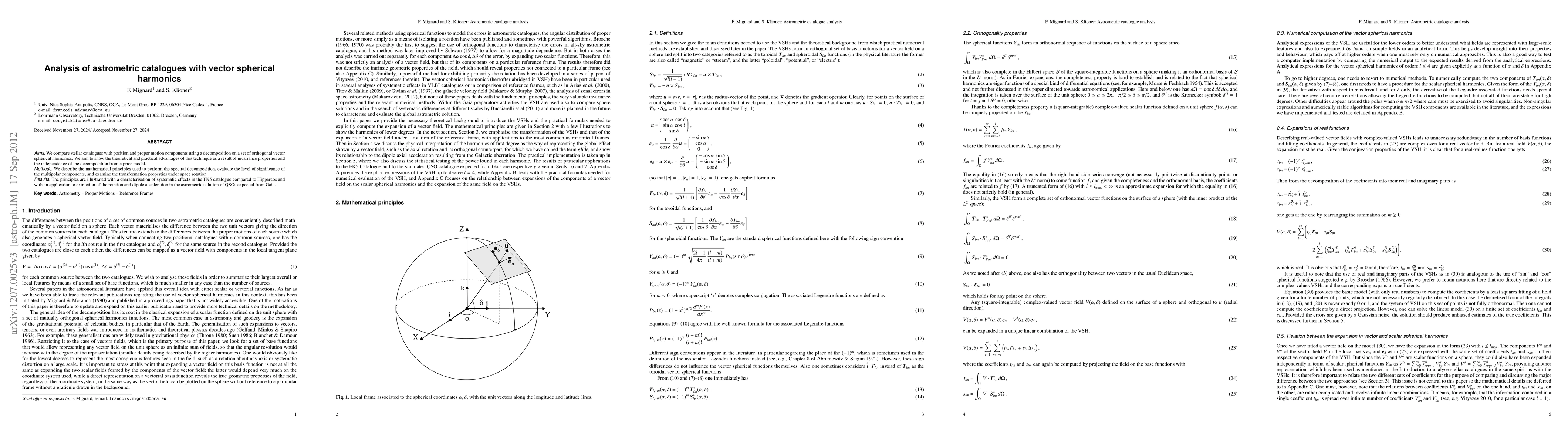 This paper analyzes astrometric catalogues using vector spherical harmonics, demonstrating the technique's advantages in decomposing position and proper motion data. It evaluates the significance of multipolar components and examines transformation properties under space rotation, illustrated through comparisons with FK5 and Hipparcos catalogues and applications to future Gaia data.