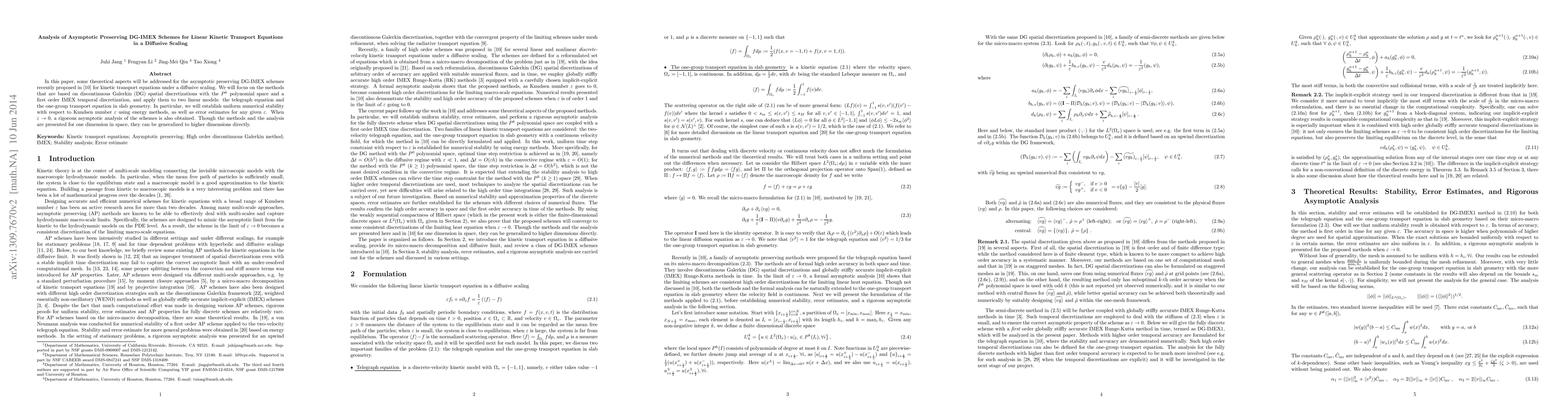 This paper analyzes asymptotic preserving DG-IMEX schemes for linear kinetic transport equations under a diffusive scaling, establishing uniform numerical stability and error estimates. The methods, based on discontinuous Galerkin spatial discretizations and first-order IMEX temporal discretization, are applied to the telegraph equation and the one-group transport equation, with rigorous asymptotic analysis as the scaling parameter approaches zero.