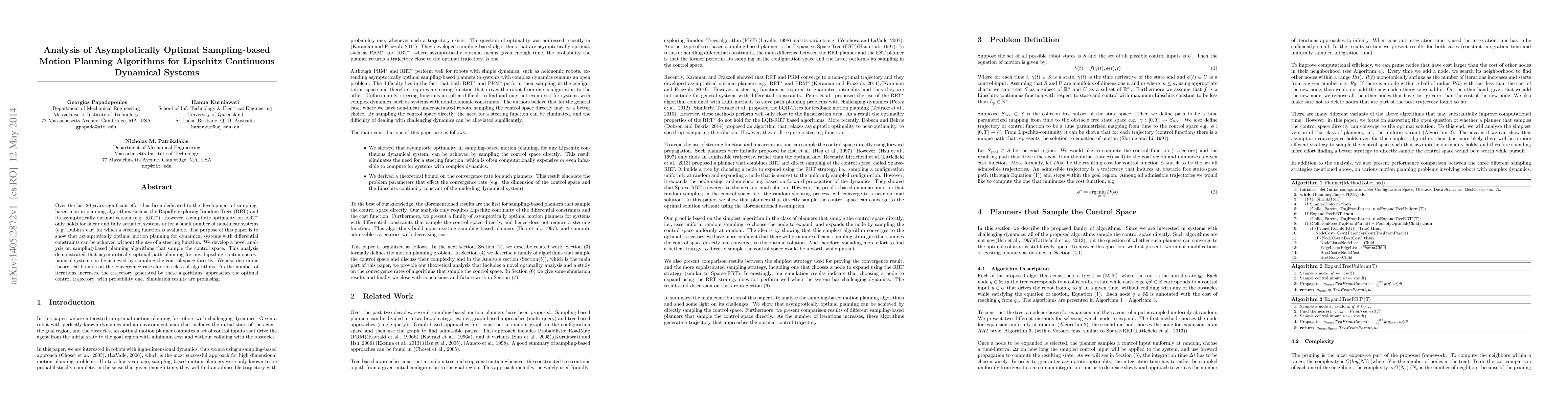 This paper presents an analysis of sampling-based motion planning algorithms that achieve asymptotic optimality for Lipschitz continuous dynamical systems without requiring a steering function. The study demonstrates that optimal path planning can be attained by directly sampling the control space, and provides theoretical bounds on convergence rates.