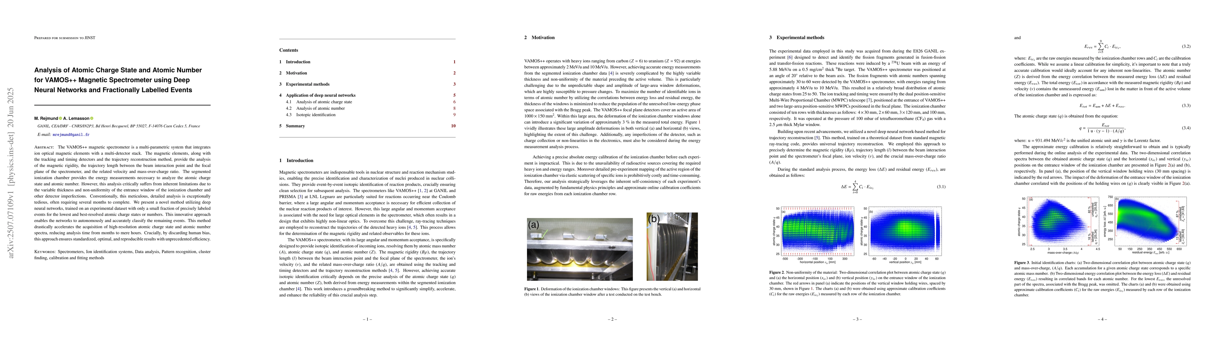 The VAMOS++ magnetic spectrometer is a multi-parametric system that integrates ion optical magnetic elements with a multi-detector stack. The magnetic elements, along with the tracking and timing detectors and the trajectory reconstruction method, provide the analysis of the magnetic rigidity, the trajectory length between the beam interaction point and the focal plane of the spectrometer, and the related velocity and mass-over-charge ratio. The segmented ionization chamber provides the energy measurements necessary to analyze the atomic charge state and atomic number. However, this analysis critically suffers from inherent limitations due to the variable thickness and non-uniformity of the entrance window of the ionization chamber and other detector imperfections. Conventionally, this meticulous, detailed analysis is exceptionally tedious, often requiring several months to complete. We present a novel method utilizing deep neural networks, trained on an experimental dataset with only a small fraction of precisely labeled events for the lowest and best-resolved atomic charge states or numbers. This innovative approach enables the networks to autonomously and accurately classify the remaining events. This method drastically accelerates the acquisition of high-resolution atomic charge state and atomic number spectra, reducing analysis time from months to mere hours. Crucially, by discarding human bias, this approach ensures standardized, optimal, and reproducible results with unprecedented efficiency.