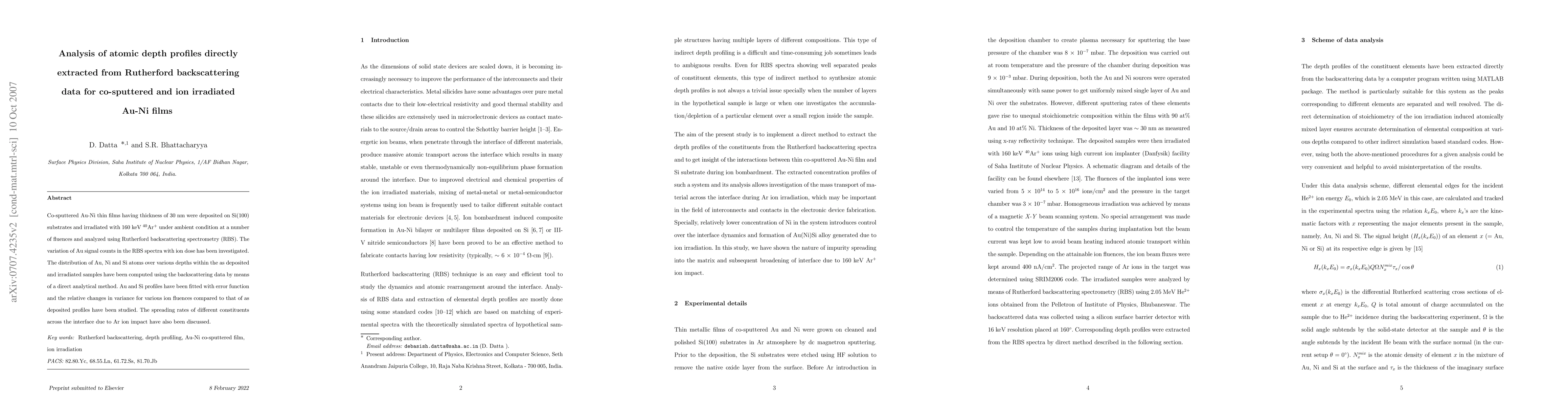 This paper analyzes atomic depth profiles in Au-Ni films deposited on Si substrates, using Rutherford backscattering spectrometry (RBS) after ion irradiation. It investigates changes in Au signal counts and distribution of Au, Ni, and Si atoms due to varying ion fluences, employing a direct analytical method to compute profiles and discuss spreading rates across the interface.