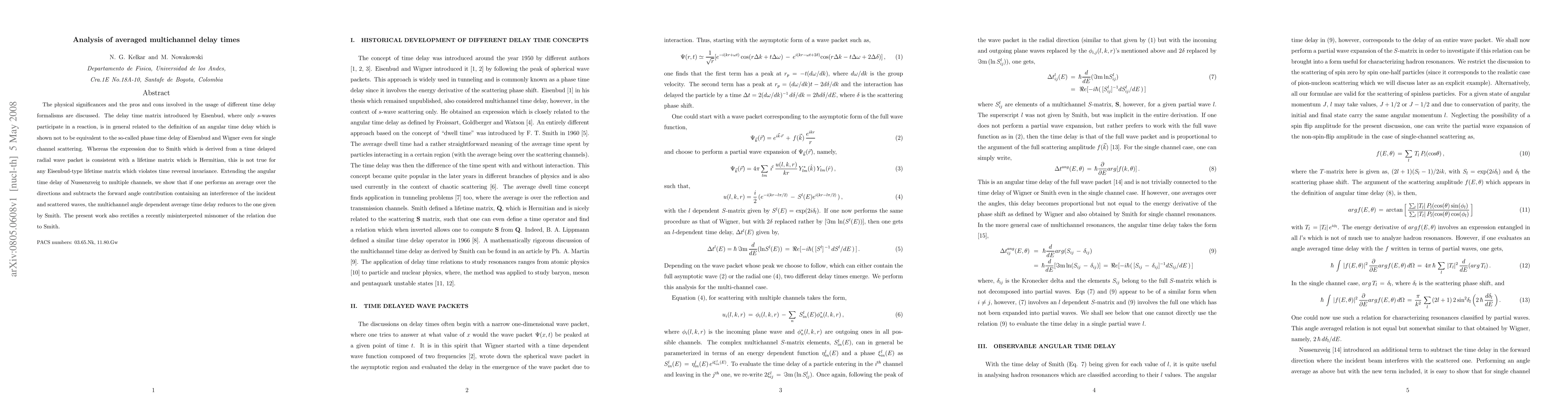 The paper analyzes time delay formalisms in physics, showing that an average multichannel delay time is consistent with a lifetime matrix from Smith's work, while other methods violate time reversal invariance.