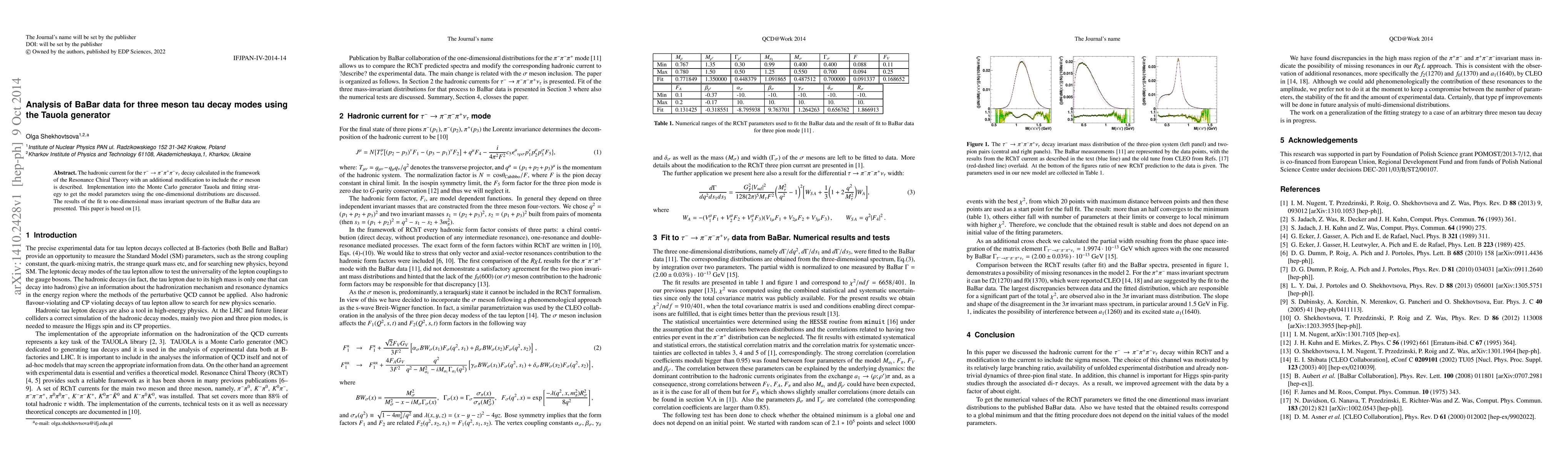 This paper analyzes BaBar data for the three-meson decay mode $\tau^- \to \pi^-\pi^+\pi^-\nu_\tau$ using the Tauola generator, incorporating the $\sigma$ meson in the Resonance Chiral Theory framework. The results of fitting the model parameters to the BaBar data's one-dimensional mass invariant spectrum are presented.