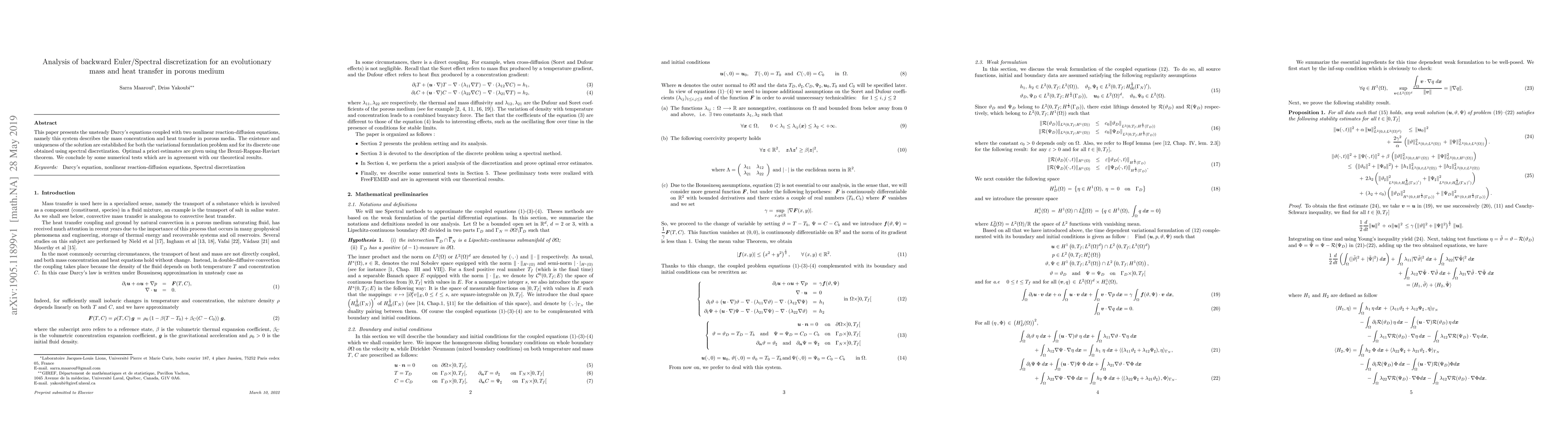 This paper proves the existence and uniqueness of solutions for Darcy's equations coupled with reaction-diffusion equations describing mass and heat transfer in porous media. Numerical tests confirm theoretical results, demonstrating the effectiveness of spectral discretization for this system.