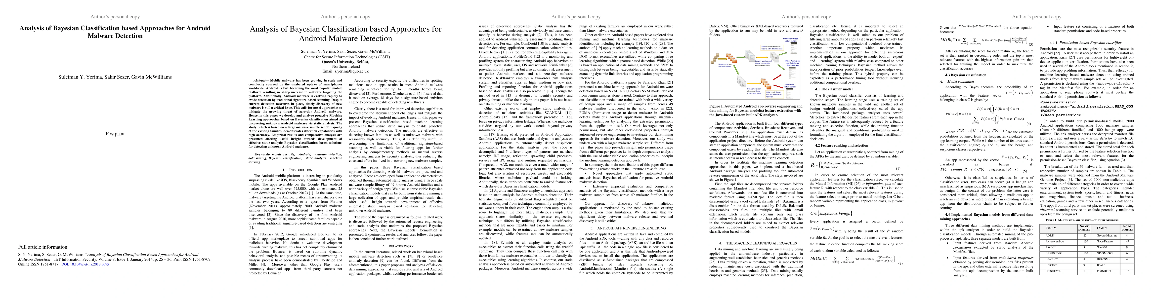 This paper develops and analyzes Bayesian classification-based machine learning approaches for detecting unknown Android malware using static analysis. The study demonstrates high accuracy in detecting malware, offering insights into effective static-analytic solutions for mitigating the threat of zero-day Android malware.