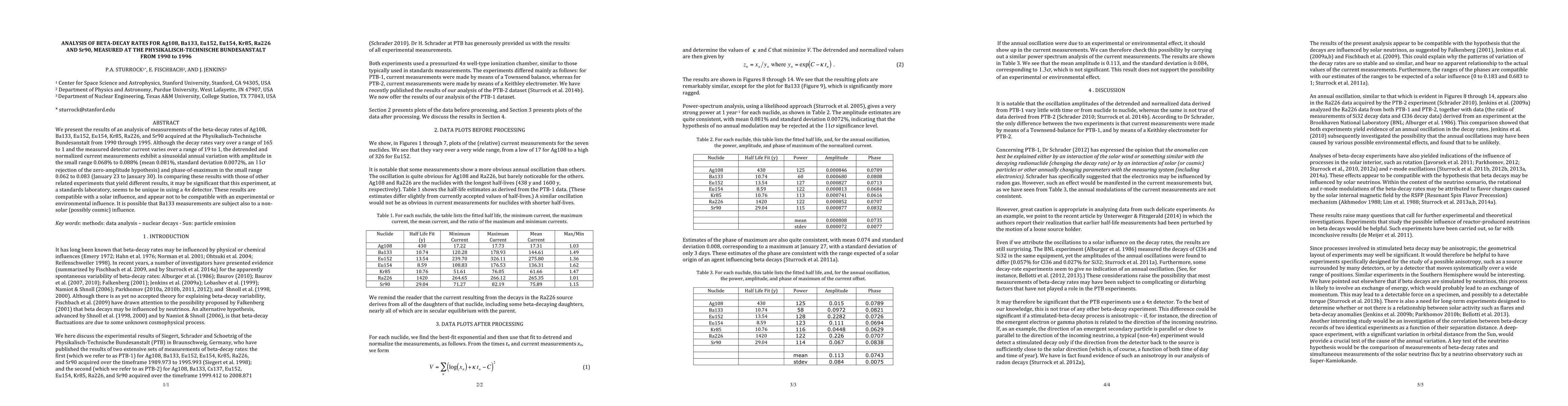 This study, conducted at Germany's Physikalisch-Technische Bundesanstalt from 1990-1995, analyzed beta-decay rates of seven isotopes. Despite wide decay rate and detector current variations, sinusoidal annual variations were found in measurements, with amplitude 0.068%-0.088% and phase 0.062-0.083. These results suggest a potential solar influence on decay rates, contrasting with other experiments, and possibly indicating a non-solar influence for Ba133 measurements.