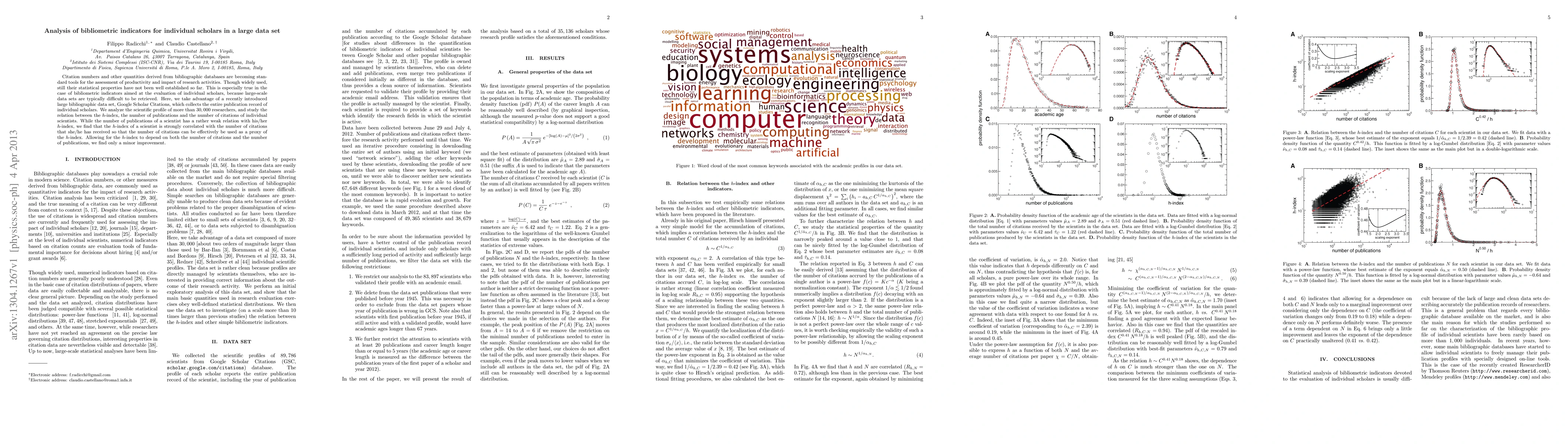 This paper analyzes bibliometric indicators, particularly the h-index, for over 30,000 researchers using Google Scholar Citations data. It finds a strong correlation between the h-index and the number of citations, suggesting citations can proxy the h-index, while the number of publications has a weak relation to the h-index.