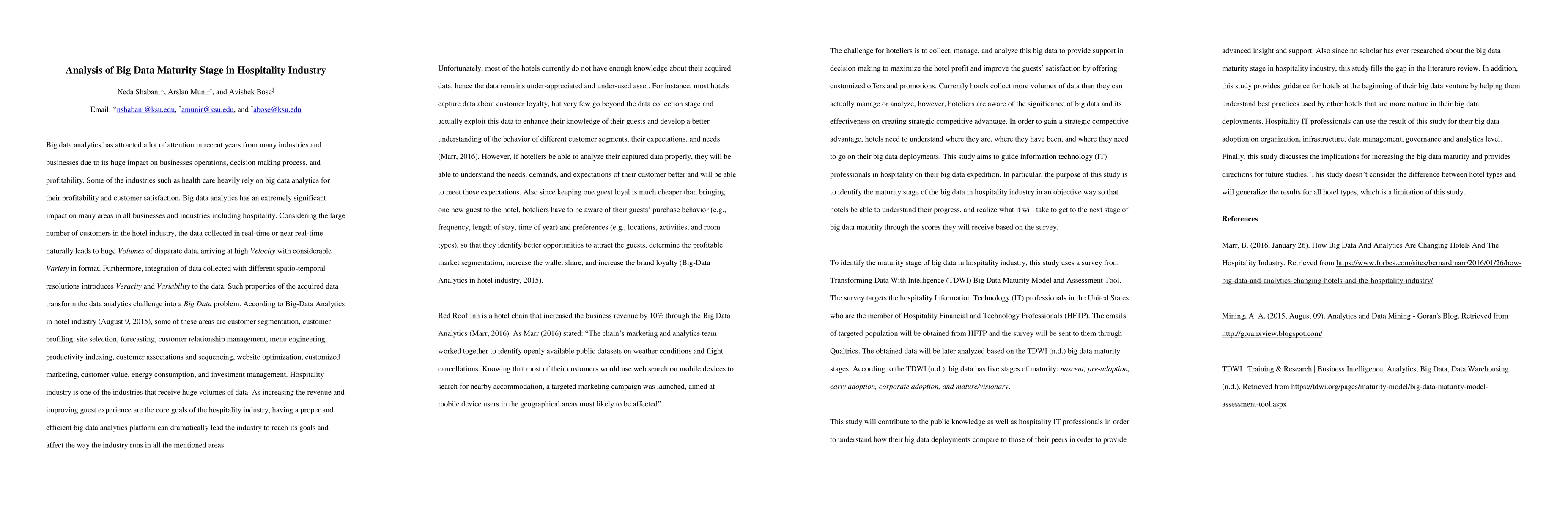 This study assesses the maturity stage of big data analytics in the hospitality industry, providing IT professionals with objective metrics to gauge their progress and identify necessary steps to advance to higher stages of big data maturity. The findings are based on survey scores to help hotels understand their current status and future development needs.