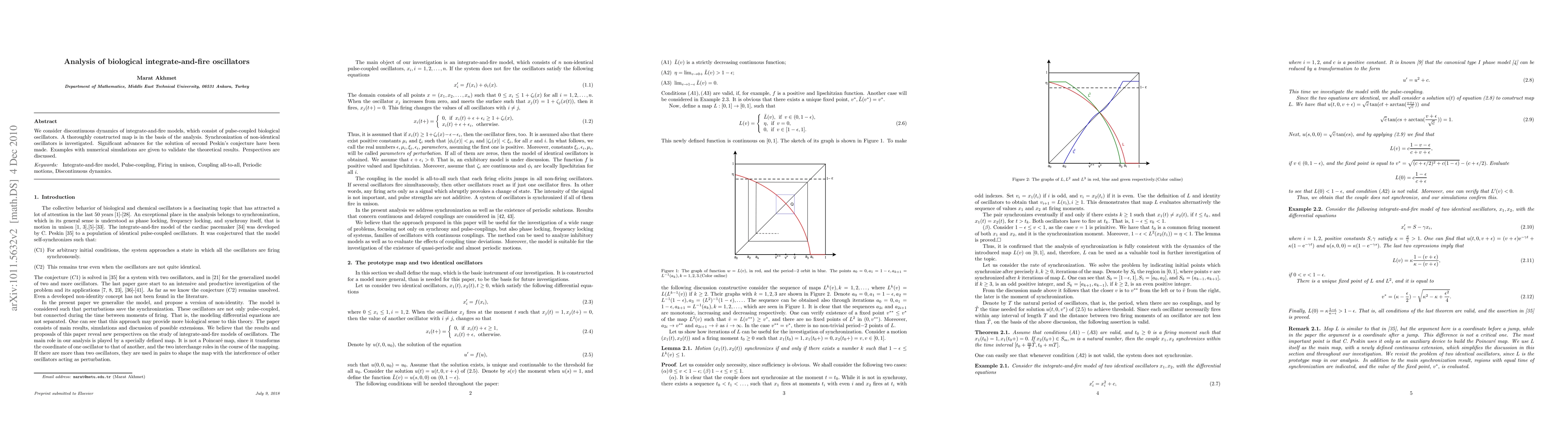 We consider discontinuous dynamics of integrate-and-fire models, which consist of pulse-coupled biological oscillators. A thoroughly constructed map is in the basis of the analysis. Synchronization of non-identical oscillators is investigated. Significant advances for the solution of second Peskin's conjecture have been made. Examples with numerical simulations are given to validate the theoretical results. Perspectives are discussed.