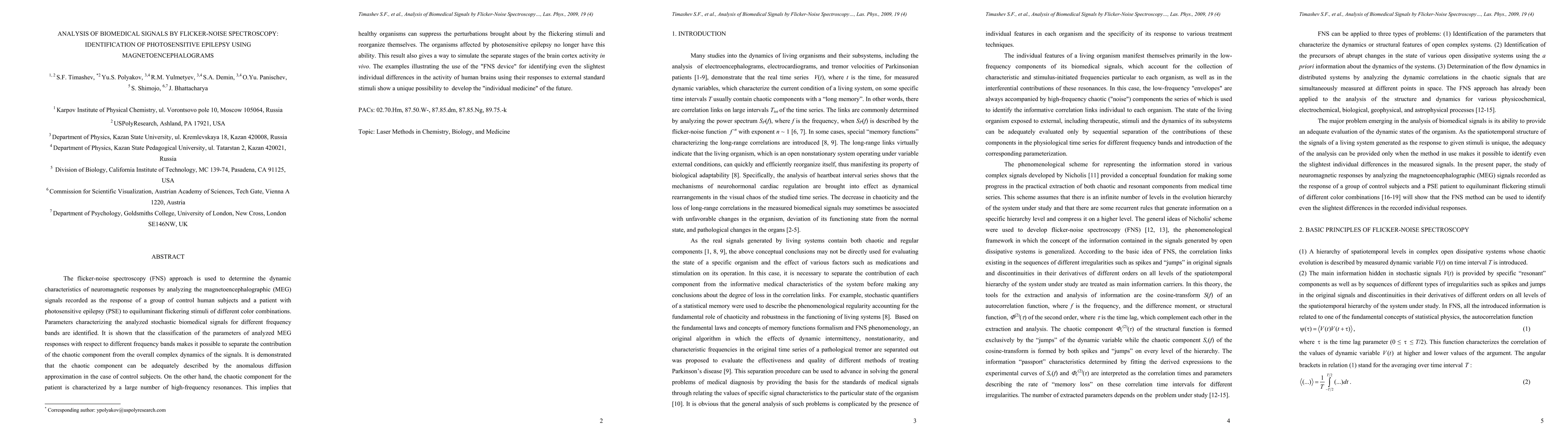 The flicker-noise spectroscopy (FNS) approach is used to determine the dynamic characteristics of neuromagnetic responses by analyzing the magnetoencephalographic (MEG) signals recorded as the response of a group of control human subjects and a patient with photosensitive epilepsy (PSE) to equiluminant flickering stimuli of different color combinations. Parameters characterizing the analyzed stochastic biomedical signals for different frequency bands are identified. It is shown that the classification of the parameters of analyzed MEG responses with respect to different frequency bands makes it possible to separate the contribution of the chaotic component from the overall complex dynamics of the signals. It is demonstrated that the chaotic component can be adequately described by the anomalous diffusion approximation in the case of control subjects. On the other hand, the chaotic component for the patient is characterized by a large number of high-frequency resonances. This implies that healthy organisms can suppress the perturbations brought about by the flickering stimuli and reorganize themselves. The organisms affected by photosensitive epilepsy no longer have this ability. This result also gives a way to simulate the separate stages of the brain cortex activity in vivo. The examples illustrating the use of the "FNS device" for identifying even the slightest individual differences in the activity of human brains using their responses to external standard stimuli show a unique possibility to develop the "individual medicine" of the future.