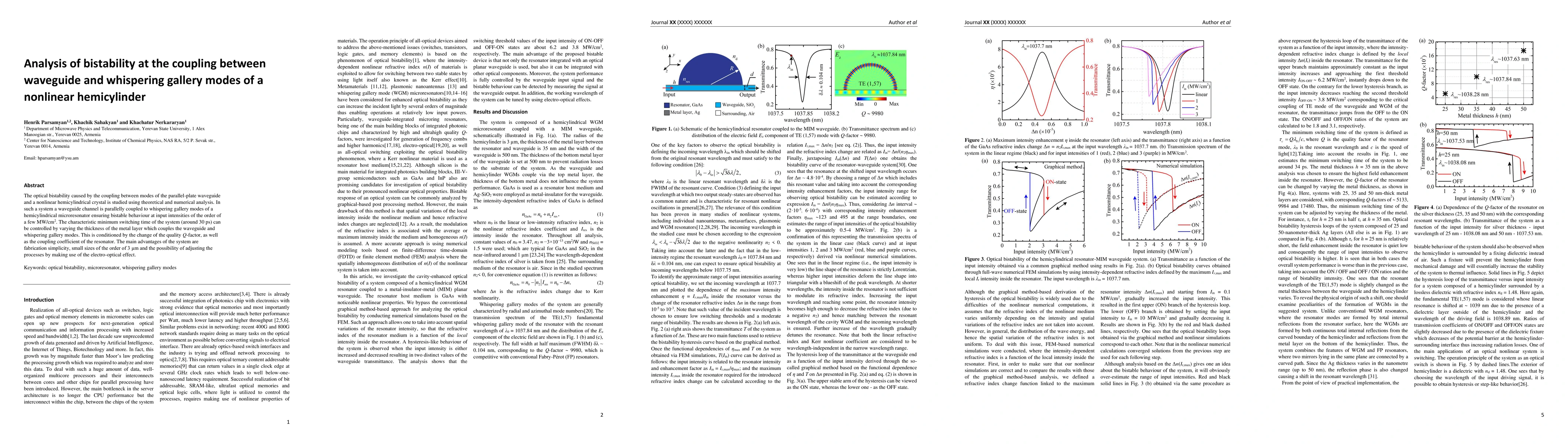 This paper investigates optical bistability through the coupling between waveguide and whispering gallery modes in a nonlinear hemicylinder, demonstrating bistable behavior at low input intensities. The study reveals that the switching time (around 30 ps) and Q-factor can be controlled by adjusting the thickness of the coupling metal layer, offering a simple, small-scale system with potential for electro-optical adjustments.