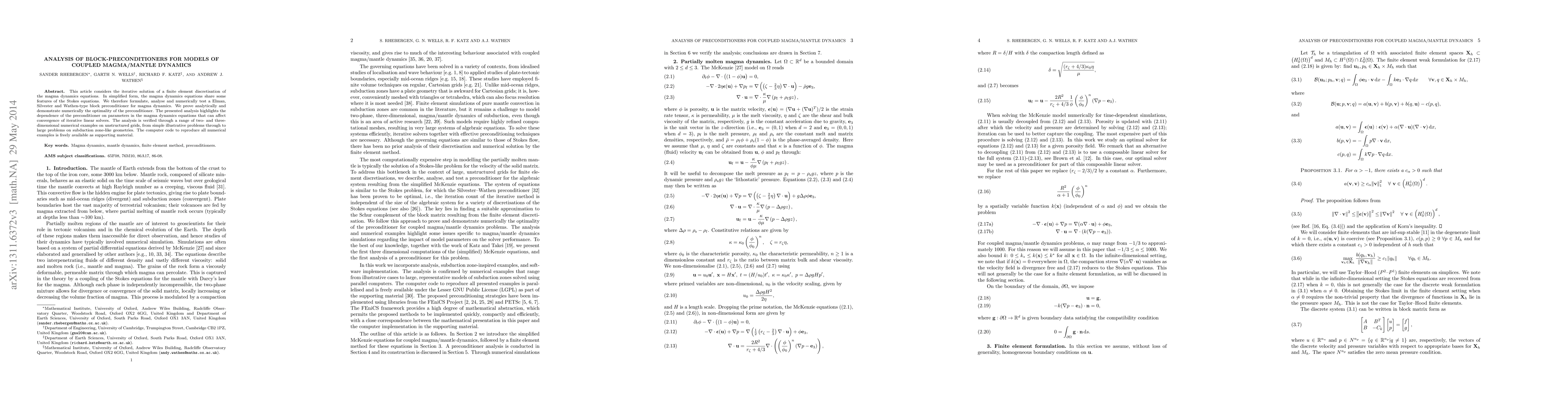 This article considers the iterative solution of a finite element discretisation of the magma dynamics equations. In simplified form, the magma dynamics equations share some features of the Stokes equations. We therefore formulate, analyse and numerically test a Elman, Silvester and Wathen-type block preconditioner for magma dynamics. We prove analytically and demonstrate numerically the optimality of the preconditioner. The presented analysis highlights the dependence of the preconditioner on parameters in the magma dynamics equations that can affect convergence of iterative linear solvers. The analysis is verified through a range of two- and three-dimensional numerical examples on unstructured grids, from simple illustrative problems through to large problems on subduction zone-like geometries. The computer code to reproduce all numerical examples is freely available as supporting material.
