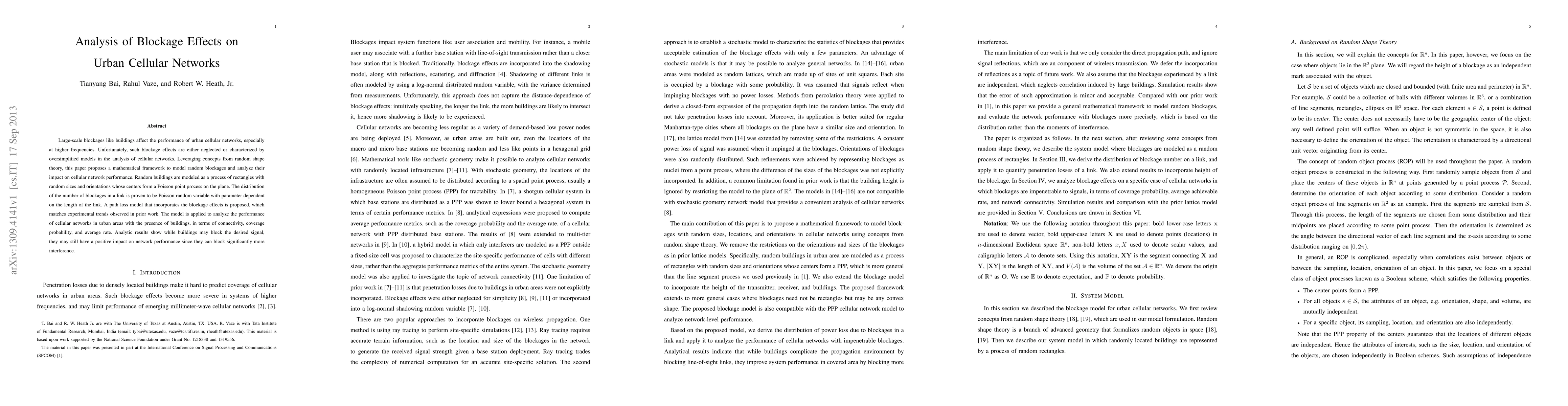This paper proposes a mathematical framework using random shape theory to model urban blockages and their impact on cellular network performance, showing that while buildings can block desired signals, they can also reduce interference, thereby positively affecting network performance. The model incorporates a Poisson point process for random buildings and provides a path loss model that aligns with experimental observations.