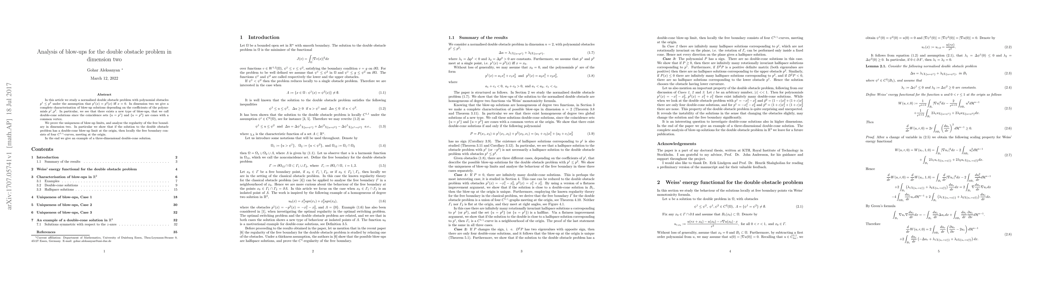 In this article we study a normalised double obstacle problem with polynomial obstacles $ p^1\leq p^2$ under the assumption that $ p^1(x)=p^2(x)$ iff $ x=0$. In dimension two we give a complete characterisation of blow-up solutions depending on the coefficients of the polynomials $p^1, p^2$. In particular, we see that there exists a new type of blow-ups, that we call double-cone solutions since the coincidence sets $\{u=p^1\}$ and $\{u=p^2\}$ are cones with a common vertex. We prove the uniqueness of blow-up limits, and analyse the regularity of the free boundary in dimension two. In particular we show that if the solution to the double obstacle problem has a double-cone blow-up limit at the origin, then locally the free boundary consists of four $C^{1,\gamma}$-curves, meeting at the origin. In the end we give an example of a three-dimensional double-cone solution.