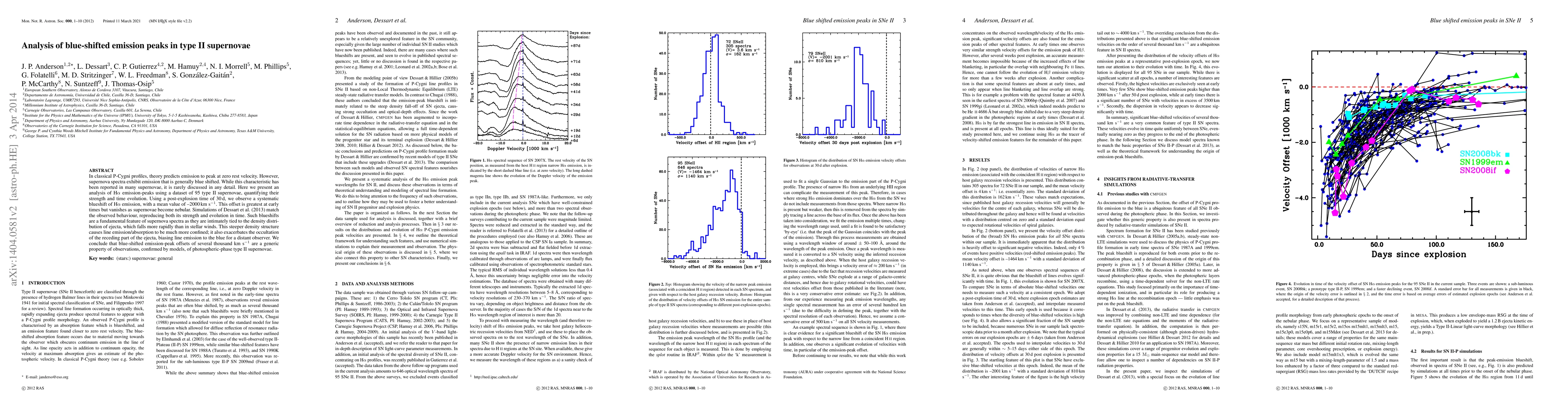 Type II supernovae exhibit blue-shifted emission peaks in H-alpha spectra, with a mean offset of -2000 kms-1, confirmed by simulations that match the observed behavior.