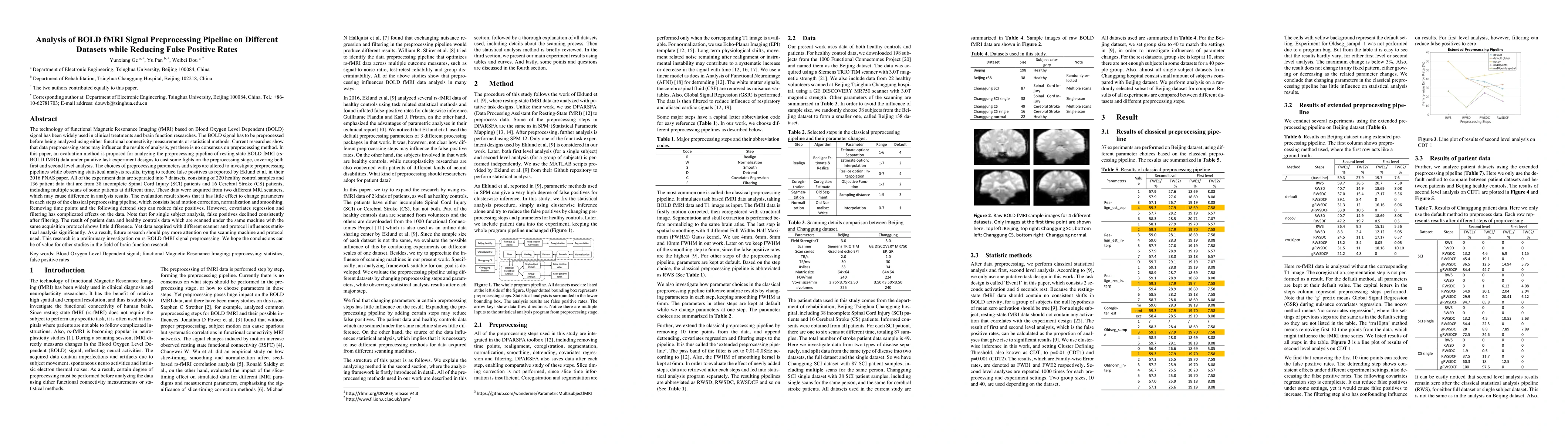 The technology of functional Magnetic Resonance Imaging (fMRI) based on Blood Oxygen Level Dependent (BOLD) signal has been widely used in clinical treatments and brain function researches. The BOLD signal has to be preprocessed before being analyzed using either functional connectivity measurements or statistical methods. Current researches show that data preprocessing steps may influence the results of analysis, yet there is no consensus on preprocessing method. In this paper, an evaluation method is proposed for analyzing the preprocessing pipeline of resting state BOLD fMRI (rs-BOLD fMRI) data under putative task experiment designs to cast some lights on the preprocessing stage, covering both first and second level analysis. The choices of preprocessing parameters and steps are altered to investigate preprocessing pipelines while observing statistical analysis results, trying to reduce false positives as reported by Eklund et al. in their 2016 PNAS paper. All of the experiment data are separated into 7 datasets, consisting of 220 healthy control samples and 136 patient data that are from 38 incomplete Spinal Cord Injury (SCI) patients and 16 Cerebral Stroke (CS) patients, including multiple scans of some patients at different time. These data were acquired from two different MRI scanners, which may cause difference in analysis results. The evaluation result shows that it has little effect to change parameters in each steps of the classical preprocessing pipeline, which consists head motion correction, normalization and smoothing. Removing time points and the following detrend step can reduce false positives. However, covariates regression and filtering has complicated effects on the data. Note that for single subject analysis, false positives declined consistently after filtering. The result of patient data and healthy controls data which are scanned under the same machine with ...