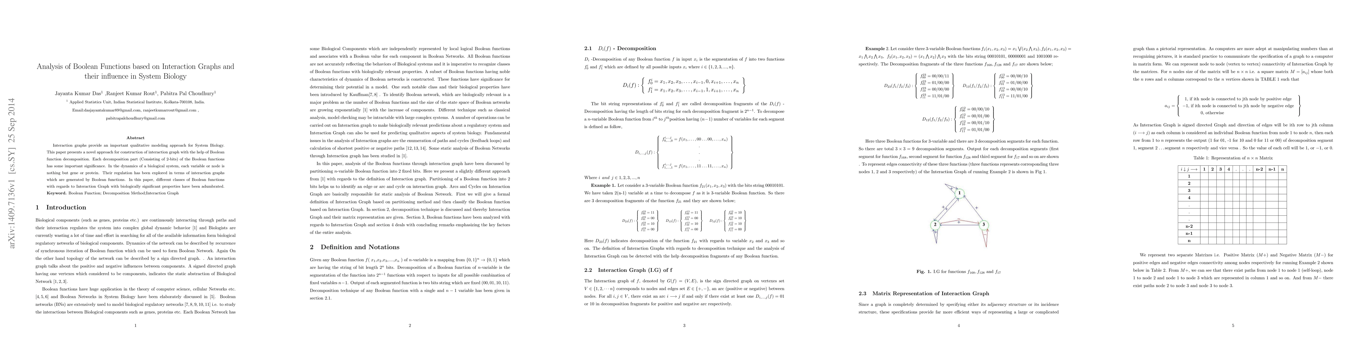 Interaction graphs provide an important qualitative modeling approach for System Biology. This paper presents a novel approach for construction of interaction graph with the help of Boolean function decomposition. Each decomposition part (Consisting of 2-bits) of the Boolean functions has some important significance. In the dynamics of a biological system, each variable or node is nothing but gene or protein. Their regulation has been explored in terms of interaction graphs which are generated by Boolean functions. In this paper, different classes of Boolean functions with regards to Interaction Graph with biologically significant properties have been adumbrated.