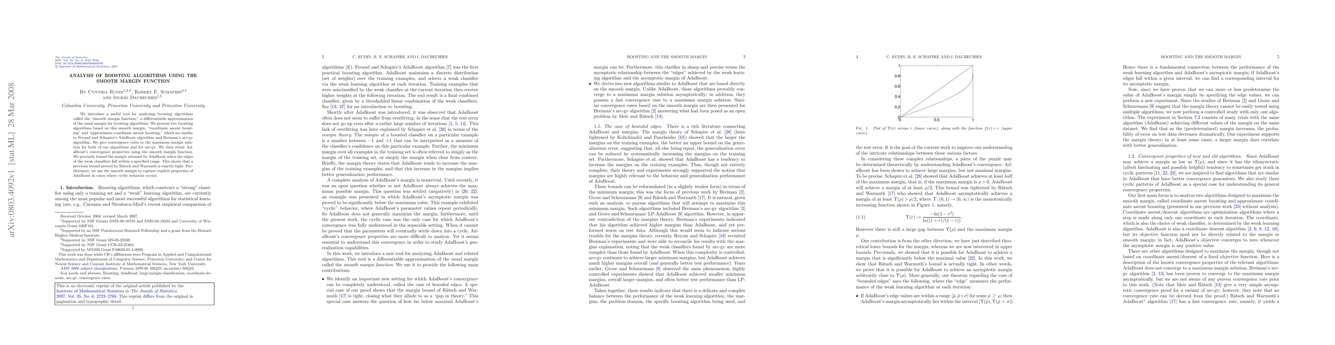 This paper introduces the smooth margin function to analyze boosting algorithms, presenting two new algorithms based on it. It provides convergence rates for these algorithms and uses the smooth margin to precisely bound AdaBoost's margin, showing the tightness of a previous bound and capturing AdaBoost's cyclic behavior.