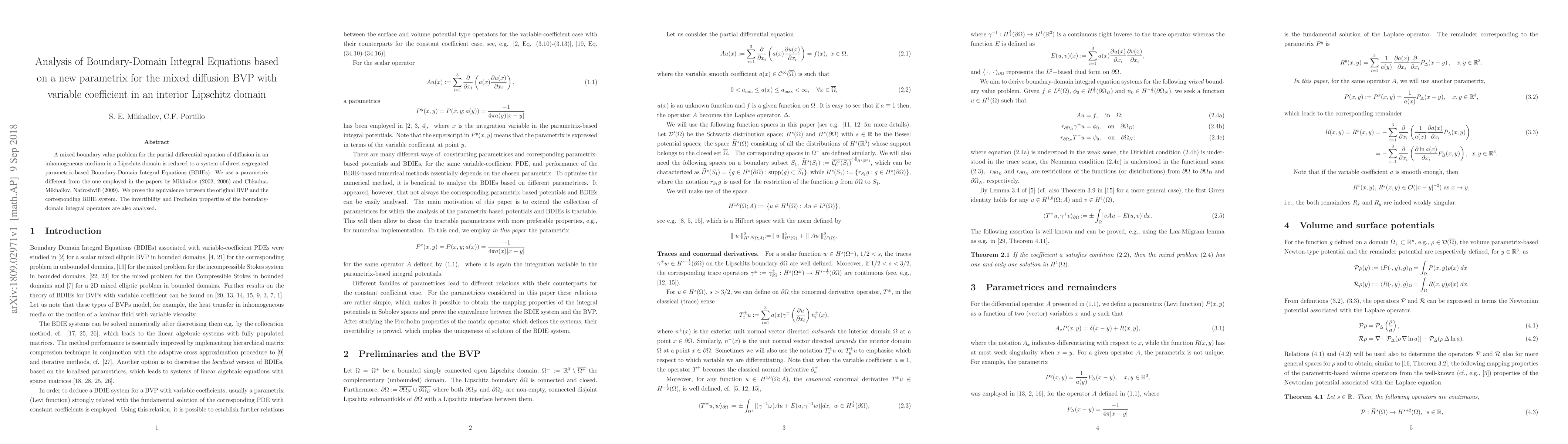 A new parametrix for a mixed diffusion BVP with variable coefficient in an interior Lipschitz domain is used to reduce the problem to a system of Boundary-Domain Integral Equations (BDIEs), proving their equivalence and analyzing their invertibility and Fredholm properties.