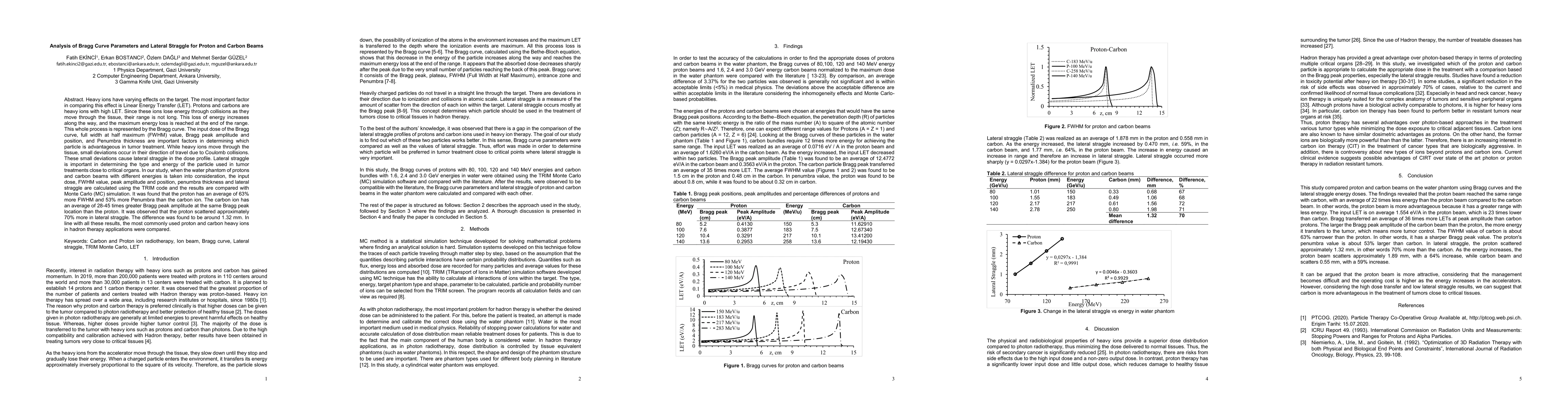 Heavy ions have varying effects on the target. The most important factor in comparing this effect is Linear Energy Transfer (LET). Protons and carbons are heavy ions with high LET. Since these ions lose energy through collisions as they move through the tissue, their range is not long. This loss of energy increases along the way, and the maximum energy loss is reached at the end of the range. This whole process is represented by the Bragg curve. The input dose of the Bragg curve, full width at half maximum (FWHM) value, Bragg peak amplitude and position, and Penumbra thickness are important factors in determining which particle is advantageous in tumor treatment. While heavy ions move through the tissue, small deviations occur in their direction of travel due to Coulomb collisions. These small deviations cause lateral straggle in the dose profile. Lateral straggle is important in determining the type and energy of the particle used in tumor treatments close to critical organs. In our study, when the water phantom of protons and carbon beams with different energies is taken into consideration, the input dose, FWHM value, peak amplitude and position, penumbra thickness and lateral straggle are calculated using the TRIM code and the results are compared with Monte Carlo (MC) simulation. It was found that the proton has an average of 63% more FWHM and 53% more Penumbra than the carbon ion. The carbon ion has an average of 28-45 times greater Bragg peak amplitude at the same Bragg peak location than the proton. It was observed that the proton scattered approximately 70% more in lateral straggle. The difference was found to be around 1.32 mm. In line with all these results, the most commonly used proton and carbon heavy ions in hadron therapy applications were compared.