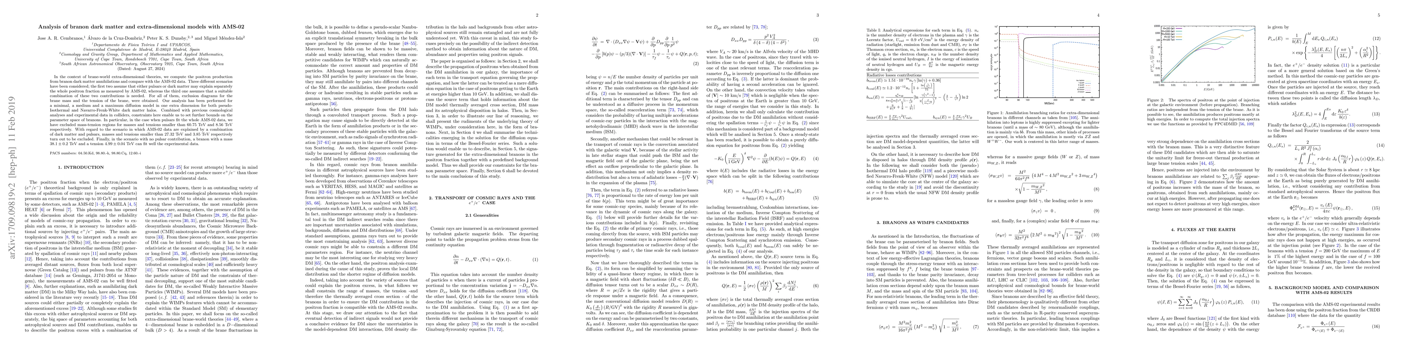 This paper analyzes positron production from branon dark matter annihilations to constrain extra-dimensional models, using AMS-02 data. The study sets bounds on branon mass and tension, discarding regions up to 28 TeV and 63 TeV for different dark matter profiles and diffusion models.
