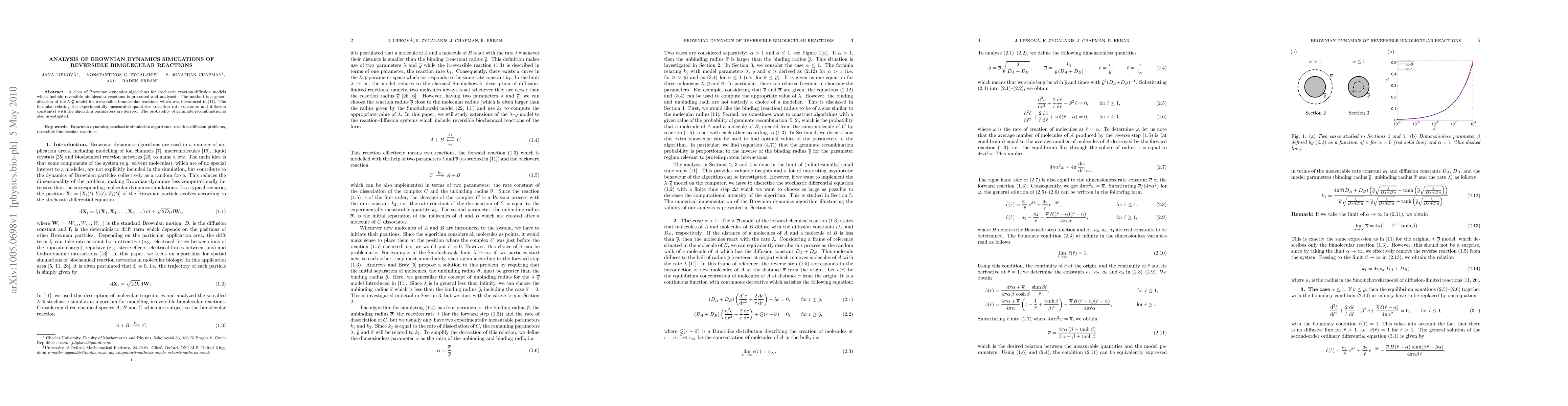This paper presents and analyzes Brownian dynamics algorithms for stochastic reaction-diffusion models involving reversible bimolecular reactions, extending the $\lambda$--$\newrho$ model for irreversible reactions. It derives relationships between measurable reaction and diffusion constants and algorithm parameters, and investigates the probability of geminate recombination.