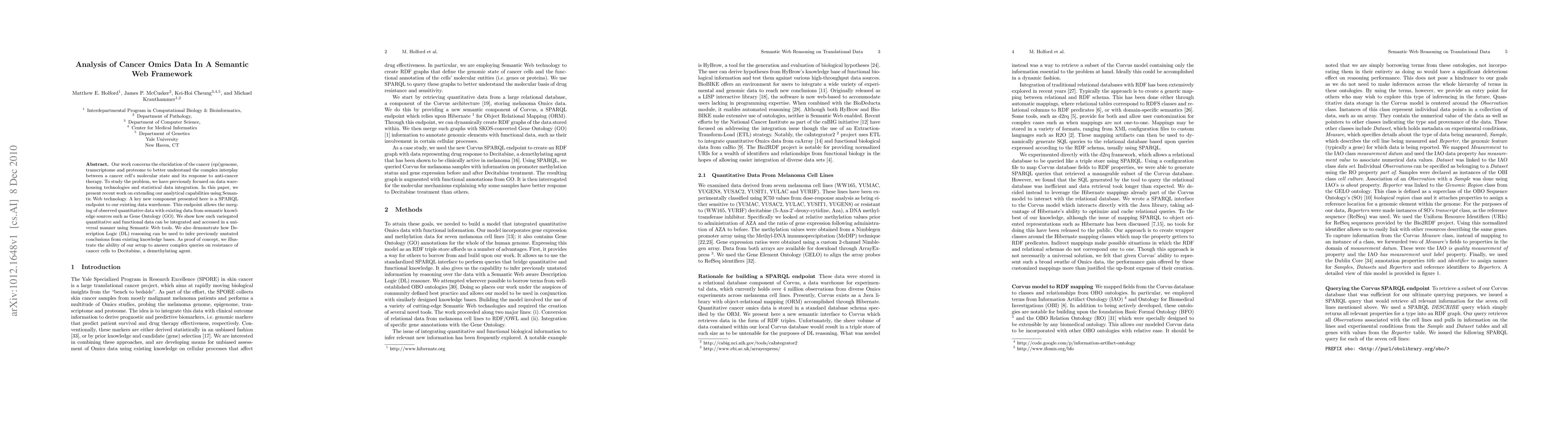 This paper explores the integration of cancer omics data within a Semantic Web framework, utilizing a SPARQL endpoint to merge quantitative data with semantic knowledge sources like Gene Ontology. The study demonstrates the use of Description Logic reasoning to infer new conclusions and showcases its application in analyzing cancer cell resistance to Decitabine.