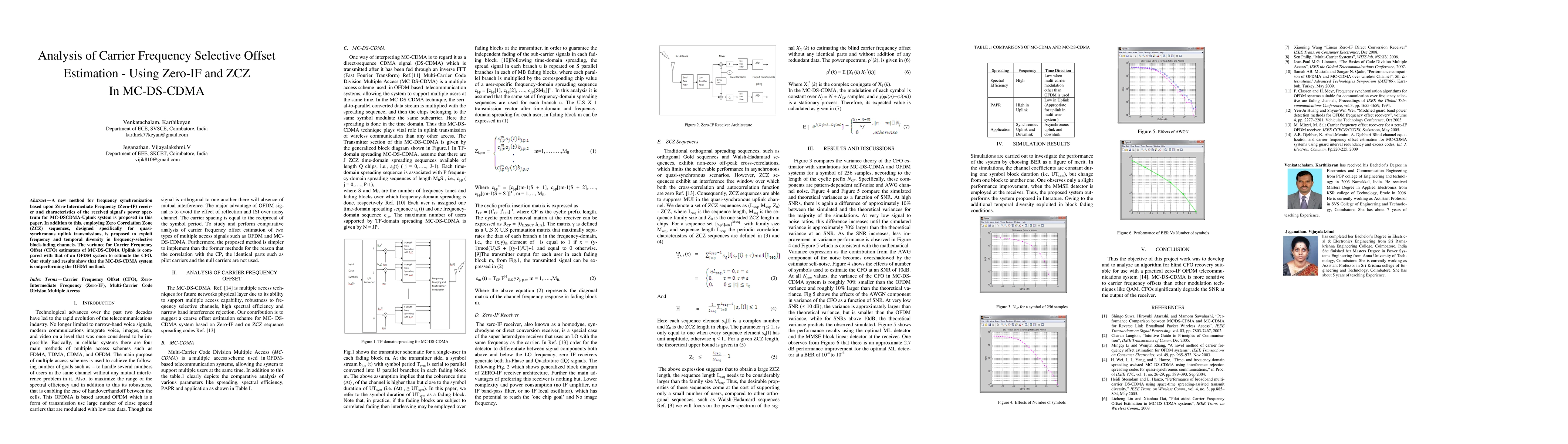 This paper proposes a new method for frequency synchronization in MC-DS-CDMA uplink systems using a Zero-IF receiver and Zero Correlation Zone sequences. It demonstrates that the MC DS CDMA system outperforms OFDM in estimating Carrier Frequency Offset (CFO) due to better exploitation of frequency and temporal diversity in block fading channels.