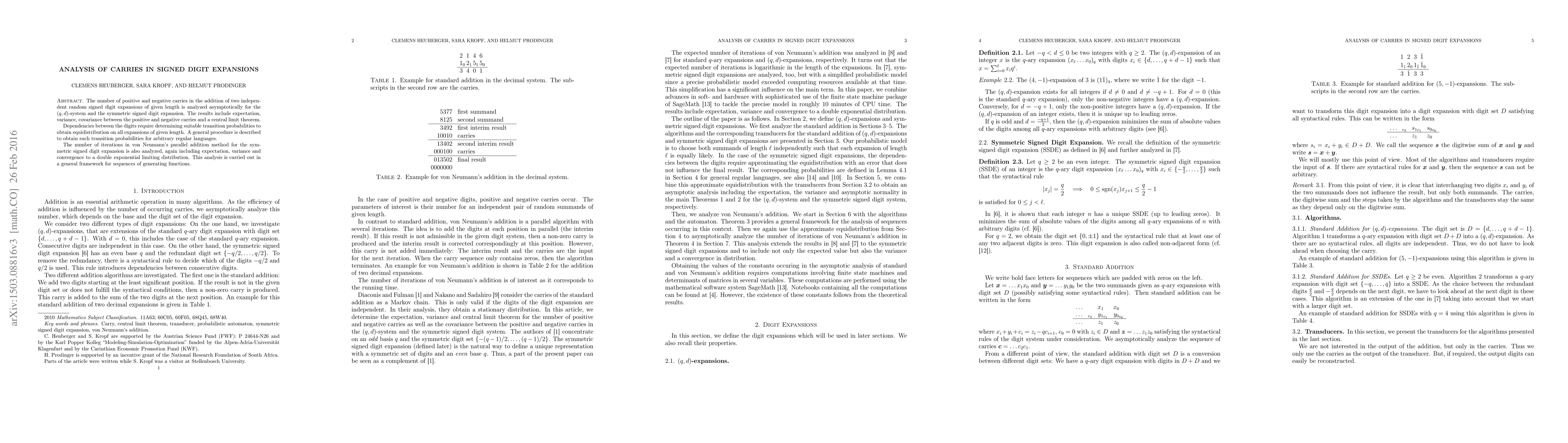 This paper analyzes carries in signed digit expansions of varying lengths, providing insights into expectations, variances, and convergence rates for both positive and negative carries.