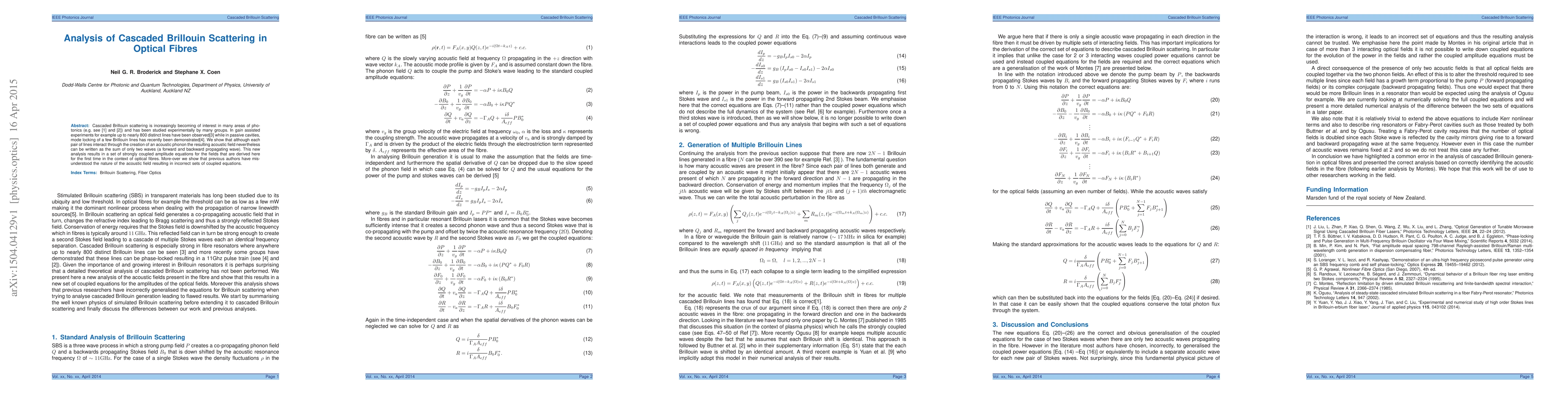 Cascaded Brillouin scattering is increasingly becoming of interest in many areas of pho- tonics (e.g. see [1] and [2]) and has been studied experimentally by many groups. In gain assisted experiments for example up to nearly 800 distinct lines have been observed[3] while in passive cavities, mode locking of a few Brillouin lines has recently been demonstrated[4]. We show that although each pair of lines interact through the creation of an acoustic phonon the resulting acoustic field nevertheless can be written as the sum of only two waves (a forward and backward propagating wave). This new analysis results in a set of strongly coupled amplitude equations for the fields that are derived here for the first time in the context of optical fibres. More-over we show that previous authors have mis- understood the nature of the acoustic field resulting in incorrect sets of coupled equations.