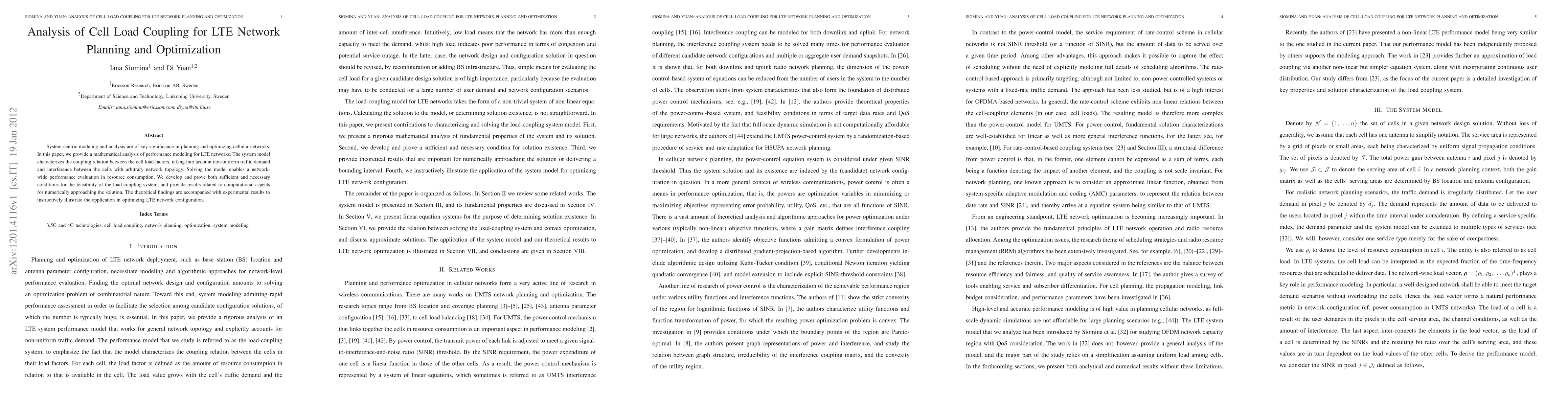 This paper mathematically analyzes LTE network performance modeling and optimization, focusing on the coupling between cell load factors considering non-uniform traffic and interference. It develops sufficient and necessary conditions for load-coupling feasibility and provides computational insights, supported by experimental results to demonstrate practical applications.