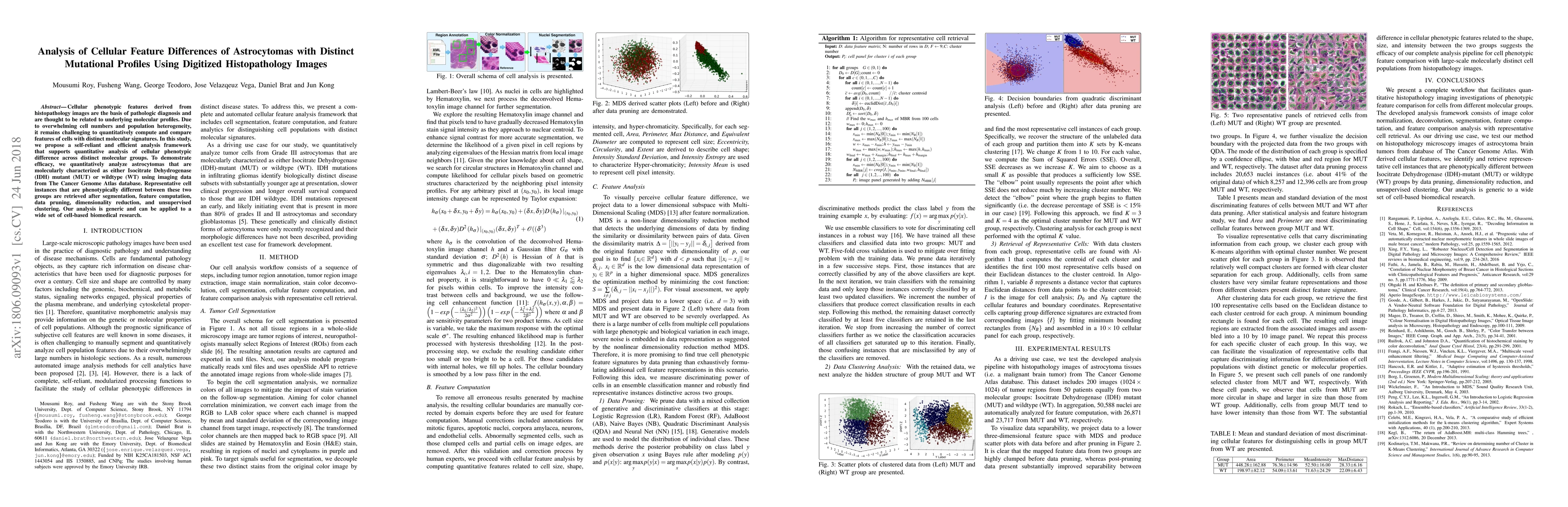 Cellular phenotypic features derived from histopathology images are the basis of pathologic diagnosis and are thought to be related to underlying molecular profiles. Due to overwhelming cell numbers and population heterogeneity, it remains challenging to quantitatively compute and compare features of cells with distinct molecular signatures. In this study, we propose a self-reliant and efficient analysis framework that supports quantitative analysis of cellular phenotypic difference across distinct molecular groups. To demonstrate efficacy, we quantitatively analyze astrocytomas that are molecularly characterized as either Isocitrate Dehydrogenase (IDH) mutant (MUT) or wildtype (WT) using imaging data from The Cancer Genome Atlas database. Representative cell instances that are phenotypically different between these two groups are retrieved after segmentation, feature computation, data pruning, dimensionality reduction, and unsupervised clustering. Our analysis is generic and can be applied to a wide set of cell-based biomedical research.