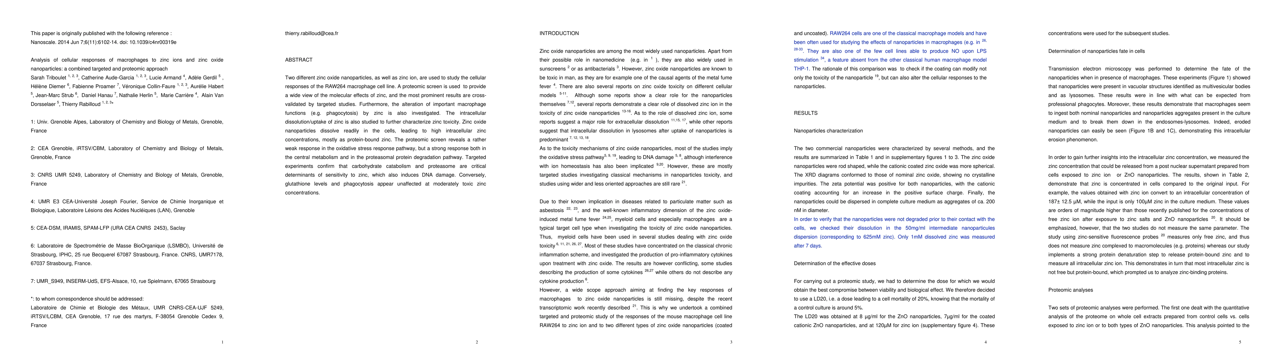 Two different zinc oxide nanoparticles, as well as zinc ions, are used to study the cellular responses of the RAW 264 macrophage cell line. A proteomic screen is used to provide a wide view of the molecular effects of zinc, and the most prominent results are cross-validated by targeted studies. Furthermore, the alteration of important macrophage functions (e.g. phagocytosis) by zinc is also investigated. The intracellular dissolution/uptake of zinc is also studied to further characterize zinc toxicity. Zinc oxide nanoparticles dissolve readily in the cells, leading to high intracellular zinc concentrations, mostly as protein-bound zinc. The proteomic screen reveals a rather weak response in the oxidative stress response pathway, but a strong response both in the central metabolism and in the proteasomal protein degradation pathway. Targeted experiments confirm that carbohydrate catabolism and proteasome are critical determinants of sensitivity to zinc, which also induces DNA damage. Conversely, glutathione levels and phagocytosis appear unaffected at moderately toxic zinc concentrations.