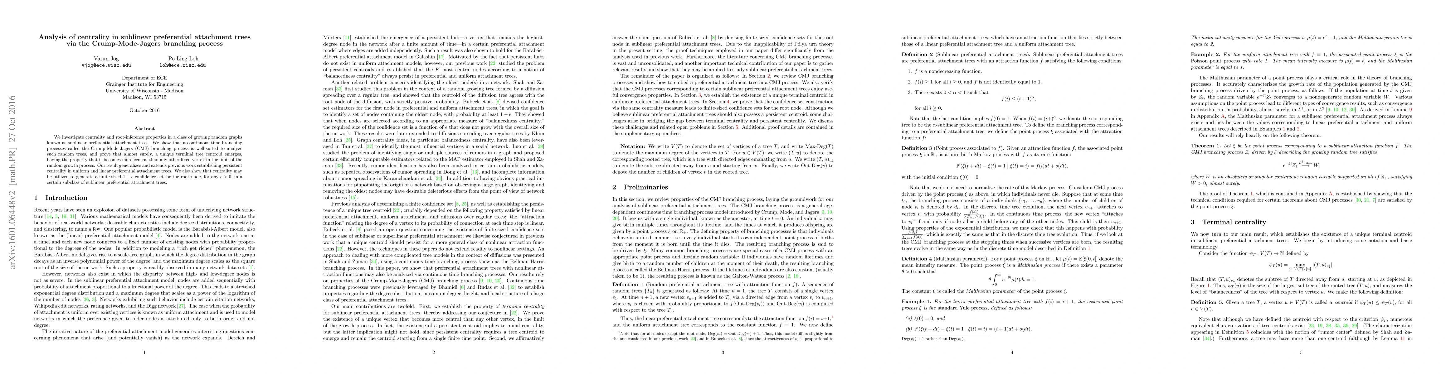 This paper analyzes centrality in sublinear preferential attachment trees using the Crump-Mode-Jagers branching process, proving that a unique terminal tree centroid becomes more central than any other vertex as the tree grows. It also demonstrates the ability to infer the root node with high confidence.