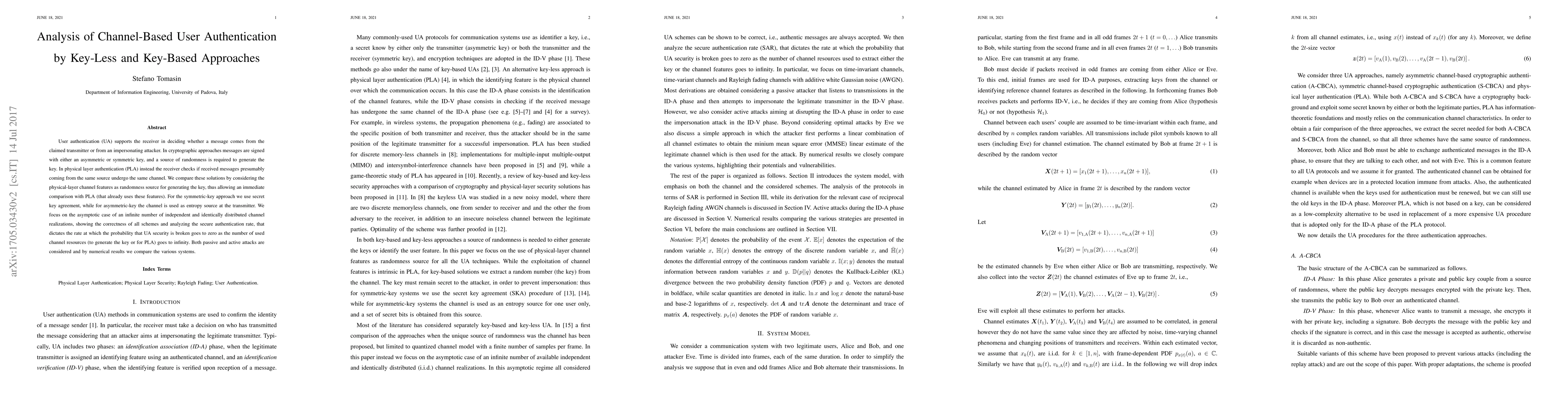 User authentication (UA) supports the receiver in deciding whether a message comes from the claimed transmitter or from an impersonating attacker. In cryptographic approaches messages are signed with either an asymmetric or symmetric key, and a source of randomness is required to generate the key. In physical layer authentication (PLA) instead the receiver checks if received messages presumably coming from the same source undergo the same channel. We compare these solutions by considering the physical-layer channel features as randomness source for generating the key, thus allowing an immediate comparison with PLA (that already uses these features). For the symmetric-key approach we use secret key agreement, while for asymmetric-key the channel is used as entropy source at the transmitter. We focus on the asymptotic case of an infinite number of independent and identically distributed channel realizations, showing the correctness of all schemes and analyzing the secure authentication rate, that dictates the rate at which the probability that UA security is broken goes to zero as the number of used channel resources (to generate the key or for PLA) goes to infinity. Both passive and active attacks are considered and by numerical results we compare the various systems.