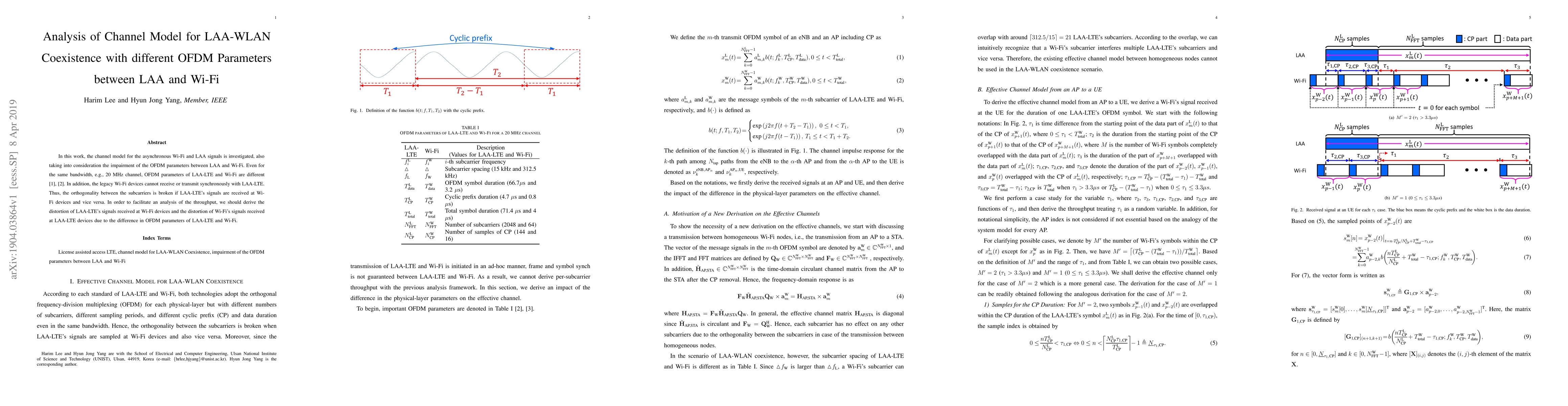 In this work, the channel model for the asynchronous Wi-Fi and LAA signals is investigated, also taking into consideration the impairment of the OFDM parameters between LAA and Wi-Fi. Even for the same bandwidth, e.g., 20 MHz channel, OFDM parameters of LAA-LTE and Wi-Fi are different [1], [2]. In addition, the legacy Wi-Fi devices cannot receive or transmit synchronously with LAA-LTE. Thus, the orthogonality between the subcarriers is broken if LAA-LTE's signals are received at Wi-Fi devices and vice versa. In order to facilitate an analysis of the throughput, we should derive the distortion of LAA-LTE's signals received at Wi-Fi devices and the distortion of Wi-Fi's signals received at LAA-LTE devices due to the difference in OFDM parameters of LAA-LTE and Wi-Fi.