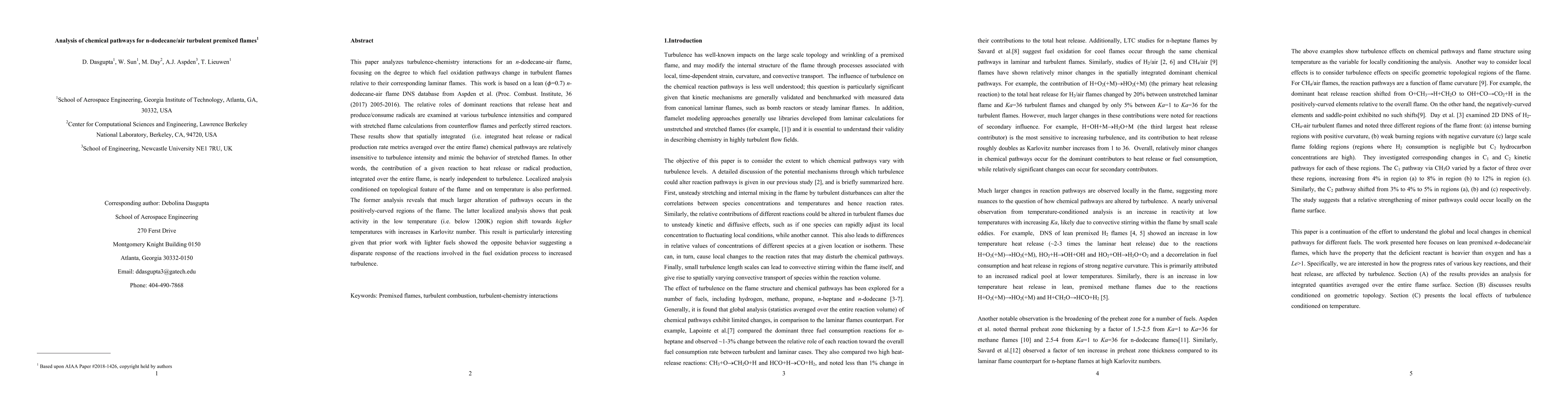 This paper analyzes turbulence-chemistry interactions for an n-dodecane-air flame, focusing on the degree to which fuel oxidation pathways change in turbulent flames relative to their corresponding laminar flames. This work is based on a lean n-dodecane-air flame DNS database from Aspden et al. (Proc. Combust. Institute, 36 (2017) 2005-2016). The relative roles of dominant reactions that release heat and produce/consume radicals are examined at various turbulence intensities and compared with stretched flame calculations from counterflow flames and perfectly stirred reactors. These results show that spatially integrated (i.e. integrated heat release or radical production rate metrics averaged over the entire flame) chemical pathways are relatively insensitive to turbulence intensity and mimic the behavior of stretched flames. In other words, the contribution of a given reaction to heat release or radical production, integrated over the entire flame, is nearly independent to turbulence. Localized analysis conditioned on topological feature of the flame and on temperature is also performed. The former analysis reveals that much larger alteration of pathways occurs in the positively-curved regions of the flame. The latter localized analysis shows that peak activity in the low temperature (i.e. below 1200K) region shift towards higher temperatures with increases in Karlovitz number. This result is particularly interesting given that prior work with lighter fuels showed the opposite behavior suggesting a disparate response of the reactions involved in the fuel oxidation process to increased turbulence.
