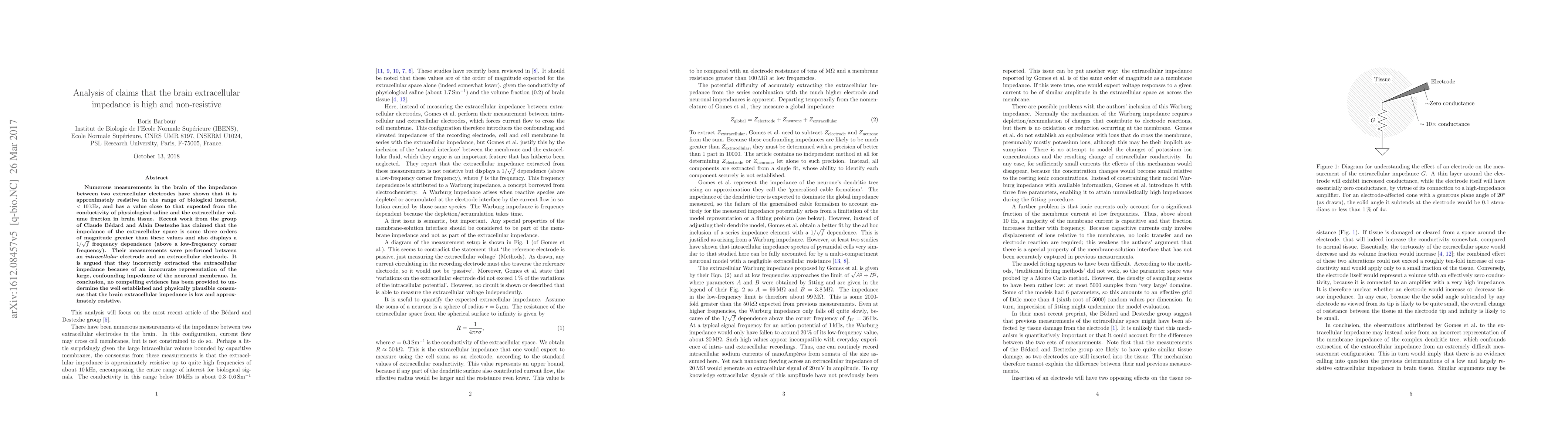 Numerous measurements in the brain of the impedance between two extracellular electrodes have shown that it is approximately resistive in the range of biological interest, $<10\,$kHz, and has a value close to that expected from the conductivity of physiological saline and the extracellular volume fraction in brain tissue. Recent work from the group of Claude B\'edard and Alain Destexhe has claimed that the impedance of the extracellular space is some three orders of magnitude greater than these values and also displays a $1/\sqrt{f}$ frequency dependence (above a low-frequency corner frequency). Their measurements were performed between an intracellular electrode and an extracellular electrode. It is argued that they incorrectly extracted the extracellular impedance because of an inaccurate representation of the large, confounding impedance of the neuronal membrane. In conclusion, no compelling evidence has been provided to undermine the well established and physically plausible consensus that the brain extracellular impedance is low and approximately resistive