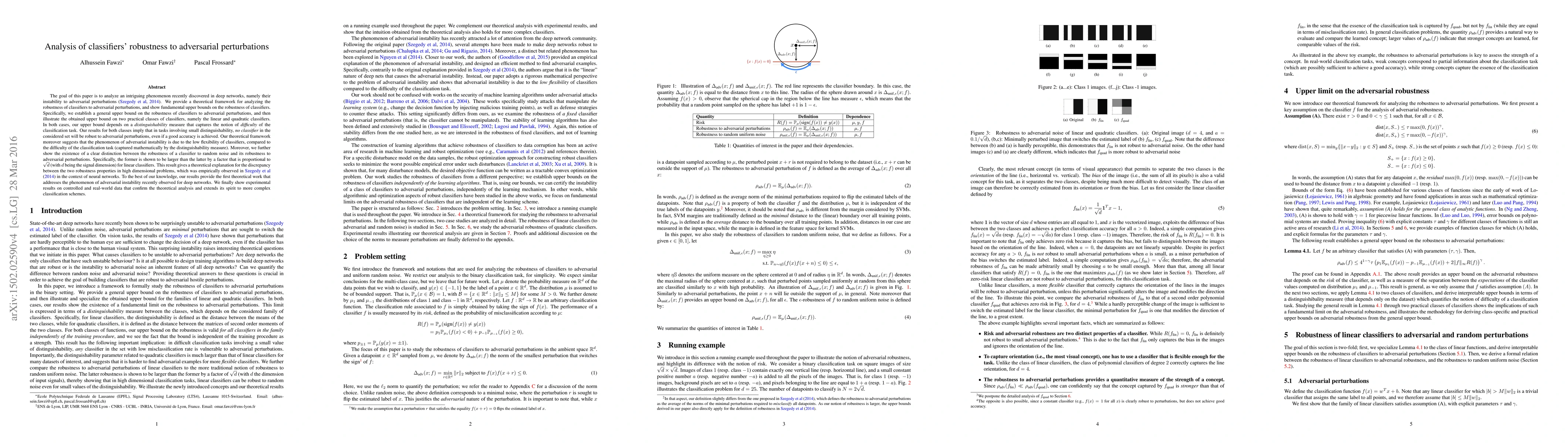 This paper develops a theoretical framework to analyze the robustness of classifiers against adversarial perturbations, establishing upper bounds for linear and quadratic classifiers. It reveals that classifiers struggle with adversarial attacks when the task's difficulty, as measured by distinguishability, is high, highlighting the discrepancy between robustness to random noise and adversarial perturbations.
