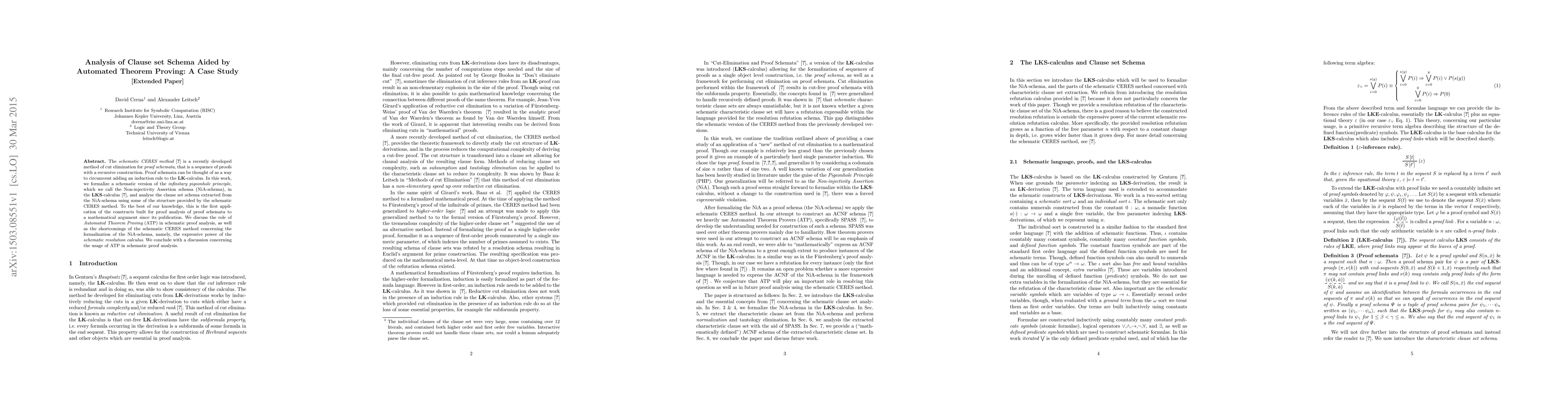 This paper formalizes a schematic version of the Non-injectivity Assertion schema (NiA-schema) in the LKS-calculus and analyzes the extracted clause set using the schematic CERES method, marking the first application of CERES to a mathematical argument. It discusses the role of Automated Theorem Proving in schematic proof analysis and identifies limitations in the expressive power of the schematic CERES method.