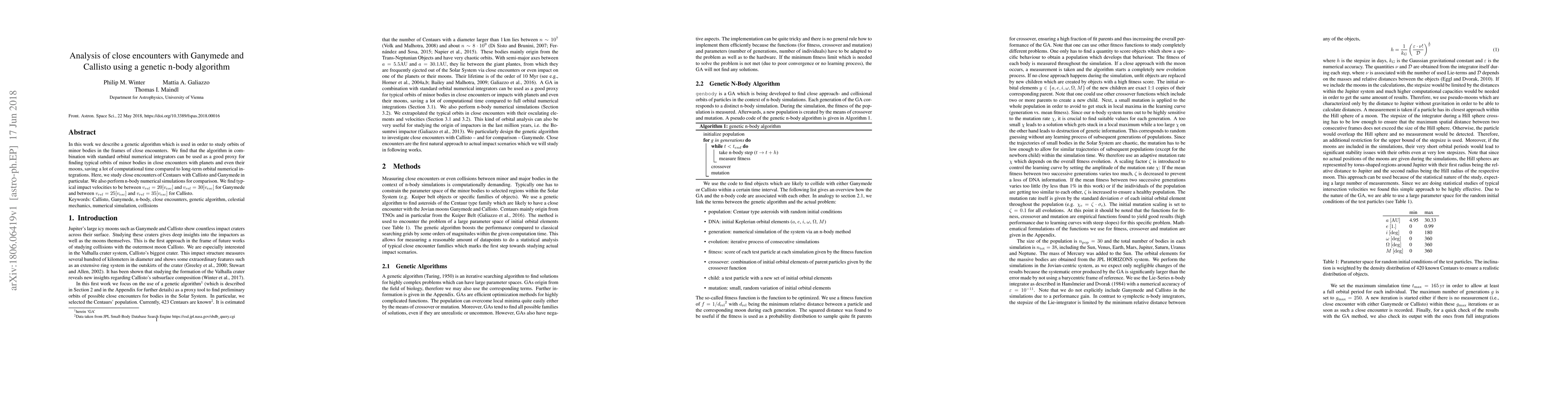This paper uses a genetic algorithm to efficiently study the orbits of minor bodies during close encounters with Jupiter's moons Ganymede and Callisto, finding typical impact velocities to be within specific ranges, and demonstrating the method's effectiveness compared to traditional numerical integration.