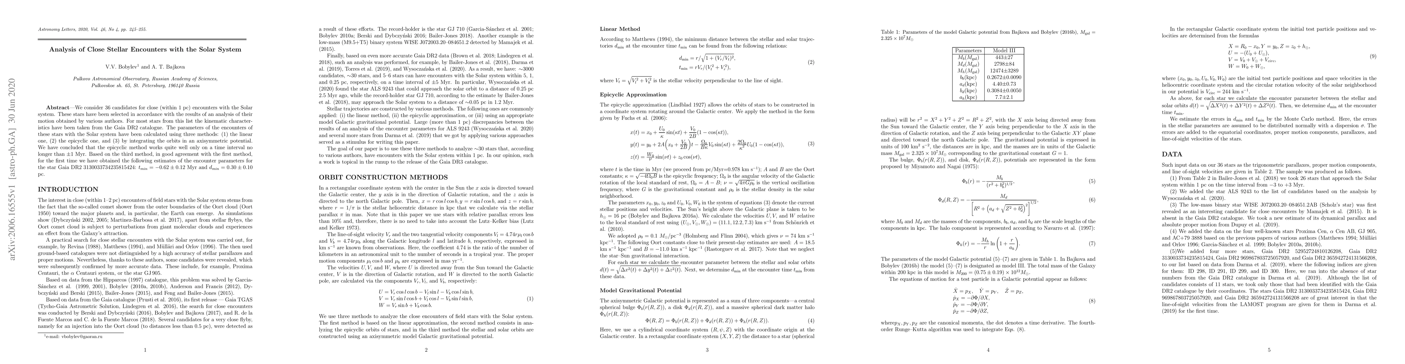 This paper analyzes 36 stars near the Solar System for close encounters, using three methods to calculate encounter parameters, finding that one method is suitable only over a short time interval.