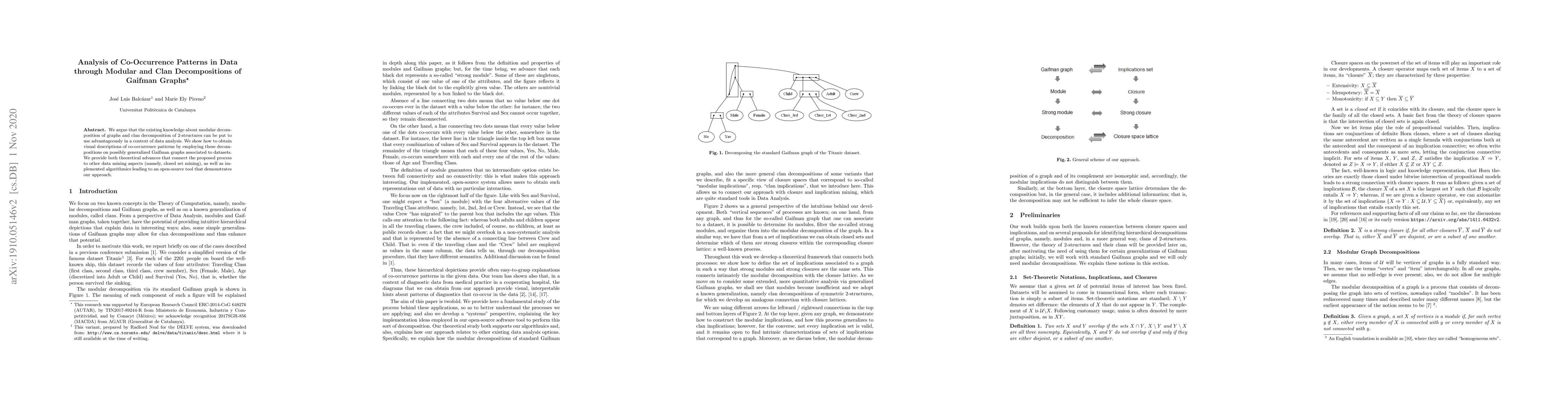 We argue that the existing knowledge about modular decomposition of graphs and clan decomposition of 2-structures can be put to use advantageously in a context of data analysis. We show how to obtain visual descriptions of co-occurrence patterns by employing these decompositions on possibly generalized Gaifman graphs associated to datasets. We provide both theoretical advances that connect the proposed process to other data mining aspects (namely, closed set mining), as well as implemented algorithmics leading to an open-source tool that demonstrates our approach.