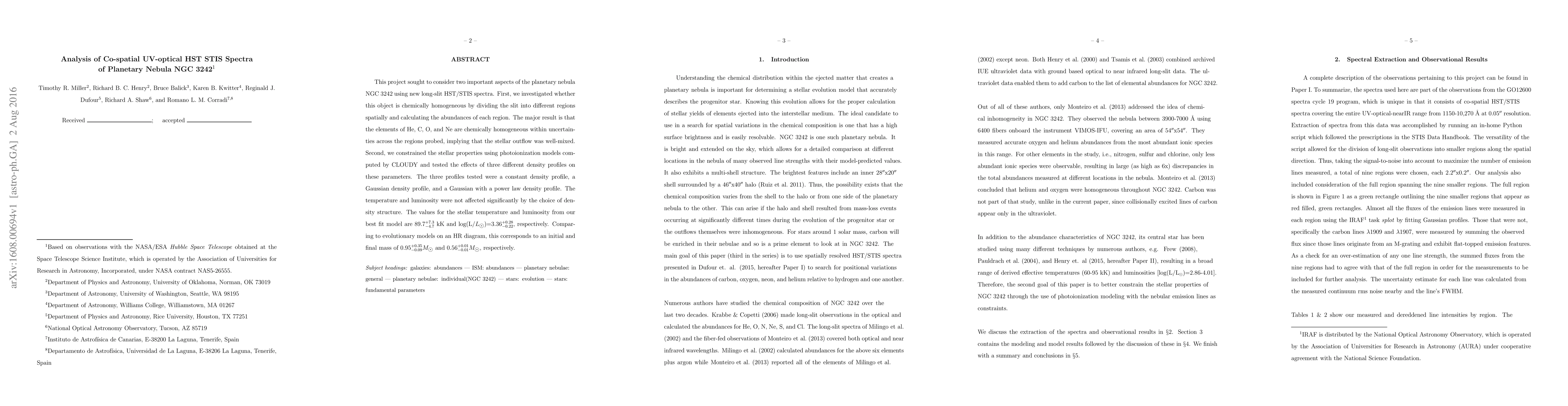 This study analyzed HST/STIS spectra of NGC 3242 to determine chemical homogeneity and constrain stellar properties, finding chemical uniformity in He, C, O, and Ne. The best fit model yielded a stellar temperature of 89.7kK and luminosity log(L/Lsol)=3.36, corresponding to initial and final stellar masses of 0.95 Msol and 0.56 Msol, respectively.