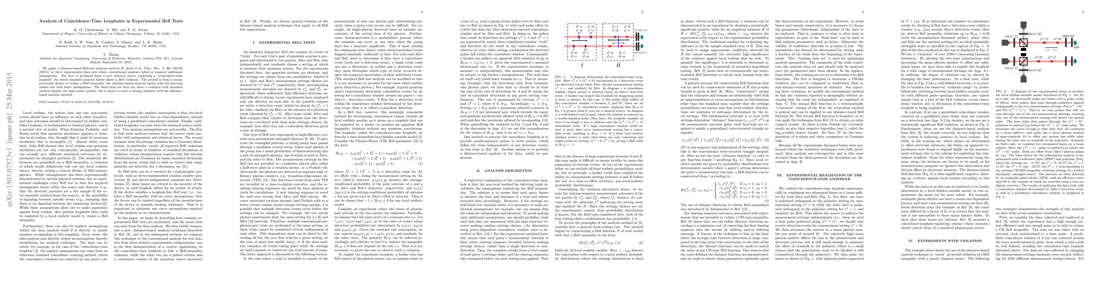 We apply a distance-based Bell-test analysis method [E. Knill et al., Phys. Rev. A. 91, 032105 (2015)] to three experimental data sets where conventional analyses failed or required additional assumptions. The first is produced from a new classical source exploiting a "coincidence-time loophole" for which standard analysis falsely shows a Bell violation. The second is from a source previously shown to violate a Bell inequality; the distance-based analysis agrees with the previous results but with fewer assumptions. The third data set does not show a violation with standard analysis despite the high source quality, but is shown to have a strong violation with the distance-based analysis method.